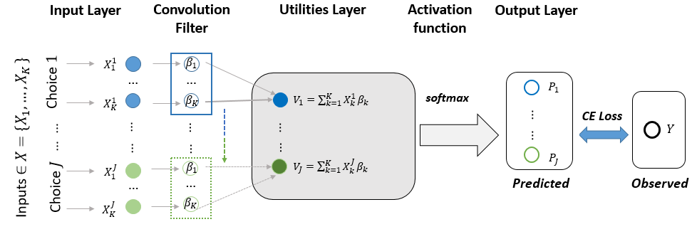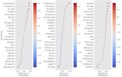 翻译:这项研究提出了一种将理论和数据驱动的选择模型结合使用人工神经网络(人工神经网络)的新颖方法。特别是,我们使用连续的矢量表示法,称为嵌入式,用于编码绝对或离散的解释变量,特别侧重于解释性和模式透明度。虽然佩雷拉(2019年)已经将代表性嵌入逻辑框架的概念化,但其层面并没有绝对明确的含义,因此在先前的工作中提供了有限的行为洞察力。我们的工作新颖之处在于通过正式将每个层面与选择选项联系起来,使嵌入矢量的矢量解释性解释性。因此,我们的方法带来的好处远远不止于简单的微调代表性改进,而不是假编码,因为它提供了可用于旅行需求分析和政策决策的具有行为意义的产出。此外,与以前提出的基于ANNE的不精确选择模型(DCMs)相比,这些模型不是为业绩牺牲解释性或只是部分解释性,我们的模型保存了所有输入变量的实用系数的可解释性系数,尽管基于ANNE原则。因此,我们的拟议模型在两个真实的世界数据模型上进行了测试,同时根据一个基本的预测性预测性模型对交付结果进行了评估,而使用了一种基本的模型。