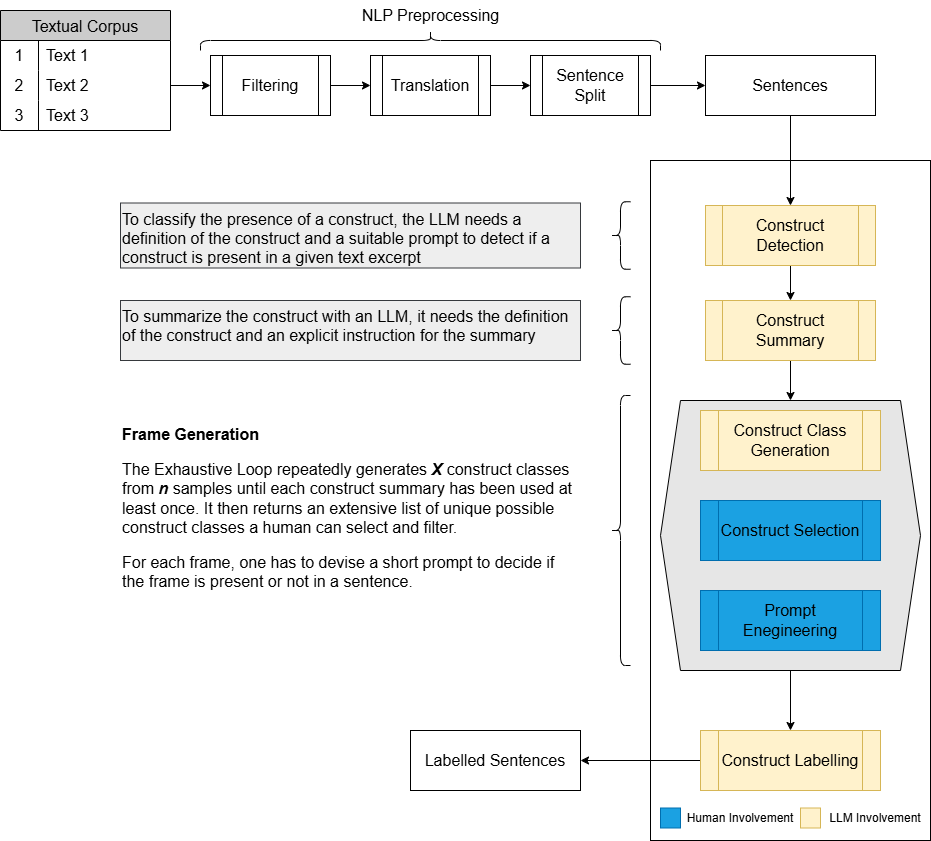 This paper presents a novel methodological framework for detecting and classifying latent constructs, including frames, narratives, and topics, from textual data using Open-Source Large Language Models (LLMs). The proposed hybrid approach combines automated summarization with human-in-the-loop validation to enhance the accuracy and interpretability of construct identification. By employing iterative sampling coupled with expert refinement, the framework guarantees methodological robustness and ensures conceptual precision. Applied to diverse data sets, including AI policy debates, newspaper articles on encryption, and the 20 Newsgroups data set, this approach demonstrates its versatility in systematically analyzing complex political discourses, media framing, and topic classification tasks.