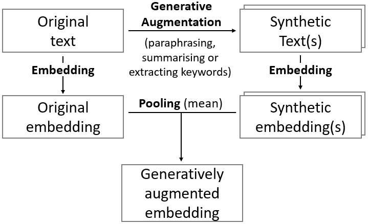 We propose an approach to enhance sentence embeddings by applying generative text models for data augmentation at inference time. Unlike conventional data augmentation that utilises synthetic training data, our approach does not require access to model parameters or the computational resources typically required for fine-tuning state-of-the-art models. Generatively Augmented Sentence Encoding uses diverse linguistic synthetic variants of input texts generated by paraphrasing, summarising, or extracting keywords, followed by pooling the original and synthetic embeddings. Experimental results on the Massive Text Embedding Benchmark for Semantic Textual Similarity (STS) demonstrate performance improvements across a range of embedding models using different generative models for augmentation. We find that generative augmentation leads to larger performance improvements for embedding models with lower baseline performance. These findings suggest that integrating generative augmentation at inference time adds semantic diversity and can enhance the robustness and generalizability of sentence embeddings for embedding models. Our results show that the degree to which generative augmentation can improve STS performance depends not only on the embedding model but also on the dataset. From a broader perspective, the approach allows trading training for inference compute.
