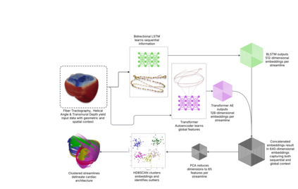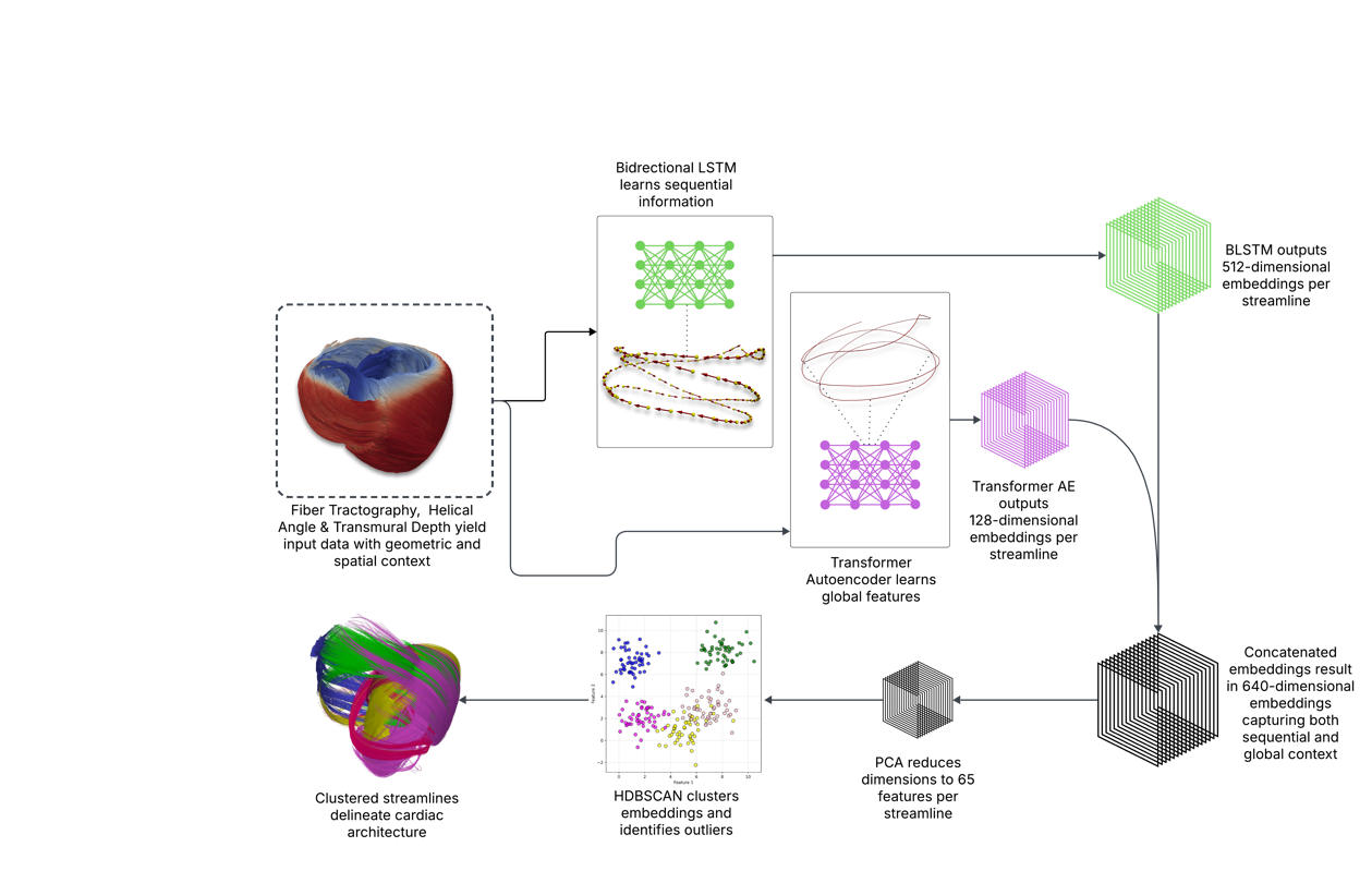Understanding the complex myocardial architecture is critical for diagnosing and treating heart disease. However, existing methods often struggle to accurately capture this intricate structure from Diffusion Tensor Imaging (DTI) data, particularly due to the lack of ground truth labels and the ambiguous, intertwined nature of fiber trajectories. We present a novel deep learning framework for unsupervised clustering of myocardial fibers, providing a data-driven approach to identifying distinct fiber bundles. We uniquely combine a Bidirectional Long Short-Term Memory network to capture local sequential information along fibers, with a Transformer autoencoder to learn global shape features, with pointwise incorporation of essential anatomical context. Clustering these representations using a density-based algorithm identifies 33 to 62 robust clusters, successfully capturing the subtle distinctions in fiber trajectories with varying levels of granularity. Our framework offers a new, flexible, and quantitative way to analyze myocardial structure, achieving a level of delineation that, to our knowledge, has not been previously achieved, with potential applications in improving surgical planning, characterizing disease-related remodeling, and ultimately, advancing personalized cardiac care.