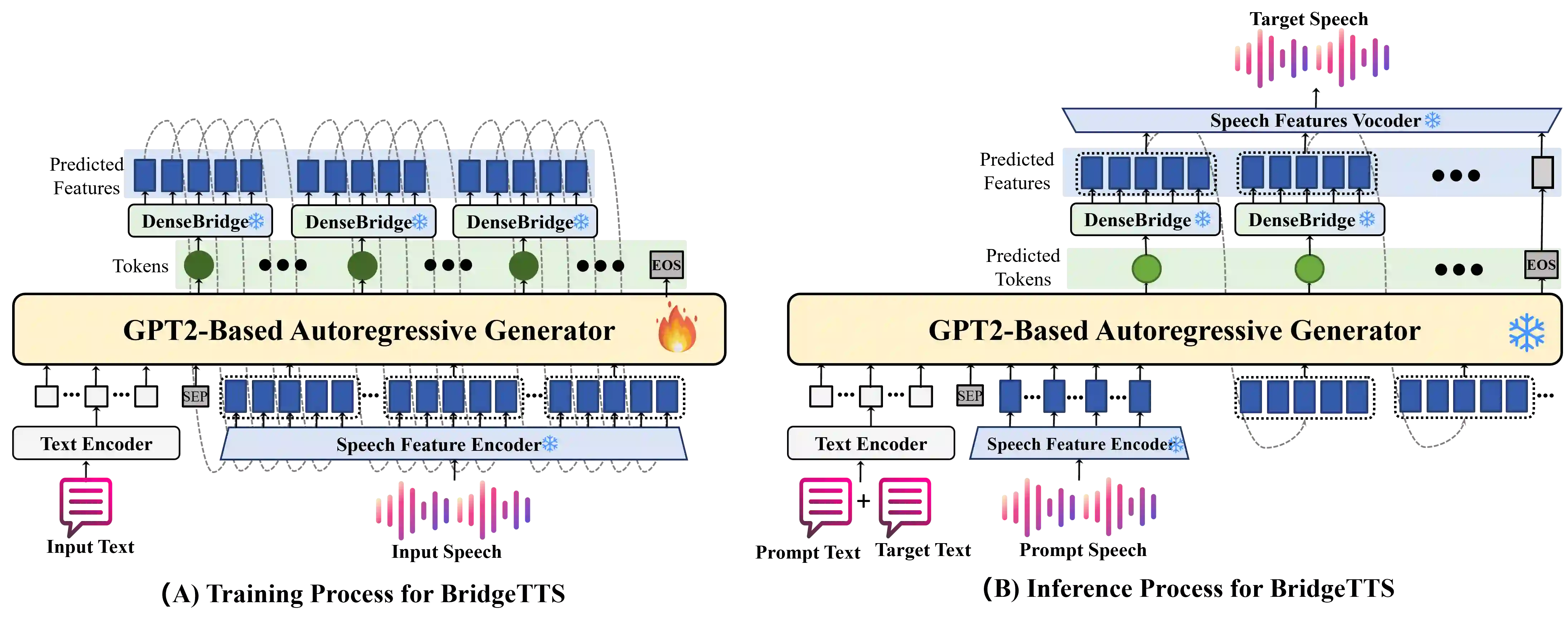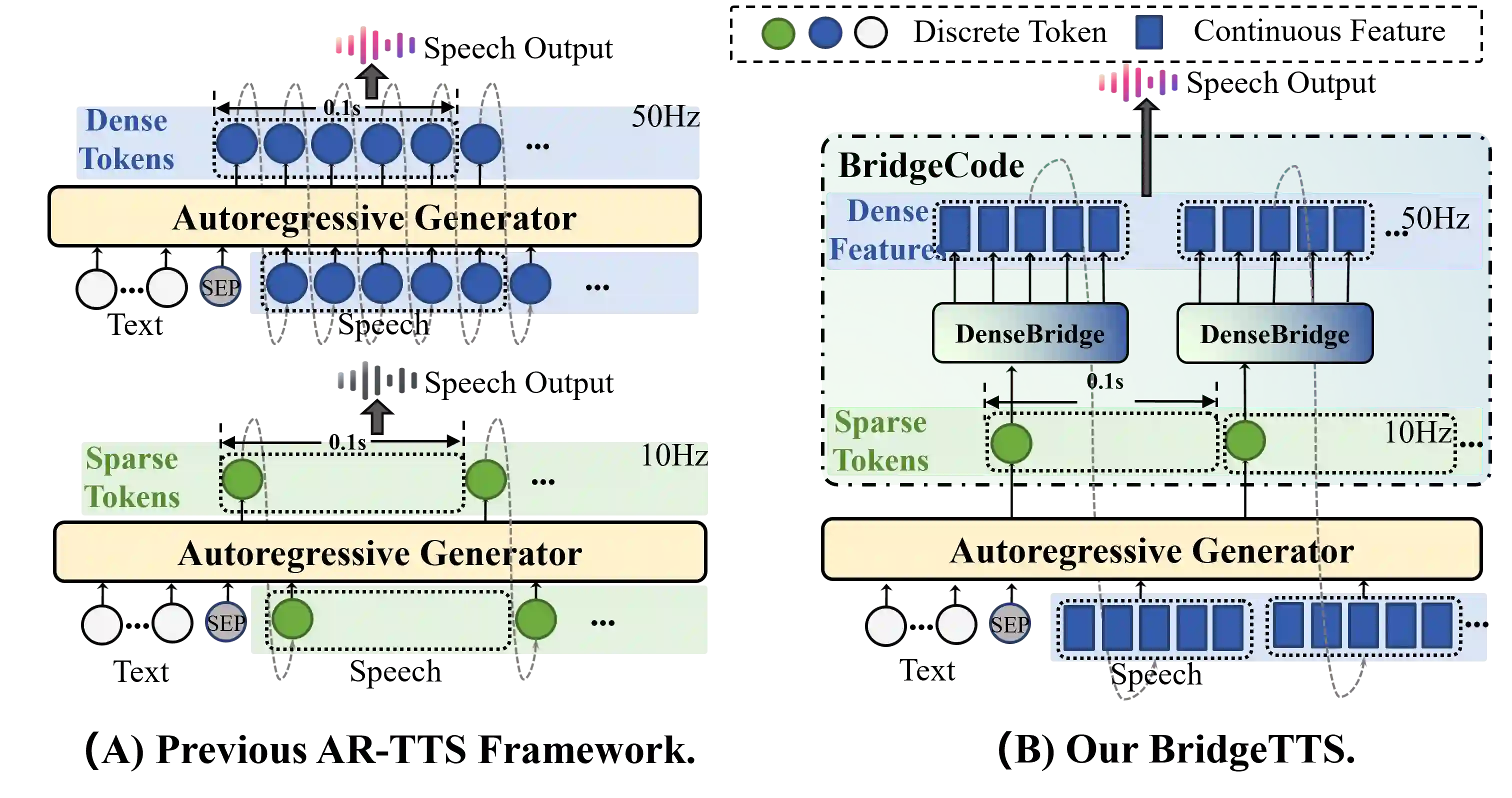 Autoregressive (AR) frameworks have recently achieved remarkable progress in zero-shot text-to-speech (TTS) by leveraging discrete speech tokens and large language model techniques. Despite their success, existing AR-based zero-shot TTS systems face two critical limitations: (i) an inherent speed-quality trade-off, as sequential token generation either reduces frame rates at the cost of expressiveness or enriches tokens at the cost of efficiency, and (ii) a text-oriented supervision mismatch, as cross-entropy loss penalizes token errors uniformly without considering the fine-grained acoustic similarity among adjacent tokens. To address these challenges, we propose BridgeTTS, a novel AR-TTS framework built upon the dual speech representation paradigm BridgeCode. BridgeTTS reduces AR iterations by predicting sparse tokens while reconstructing rich continuous features for high-quality synthesis. Joint optimization of token-level and feature-level objectives further enhances naturalness and intelligibility. Experiments demonstrate that BridgeTTS achieves competitive quality and speaker similarity while significantly accelerating synthesis. Speech demos are available at https://test1562.github.io/demo/.