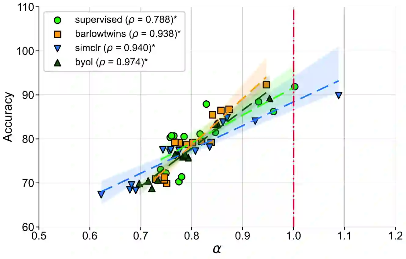 翻译:代表制学习能够利用大规模贴标签数据集,这是最近机器学习进展的核心。 获取规模上的任务相关标签往往稀缺或昂贵,促使人们需要通过自我监督学习(SSL)从未贴标签的数据集中学习。 如此庞大的未贴标签的数据集(配有数据扩增)往往能很好地覆盖基本输入分布。 然而,评价SSL算法所学的表述仍然需要培训管道中特定任务标签样本。 此外,任务特定编码的普及往往敏感于潜在的分配变化。在理论机器学习和视觉神经科学的最新进展的启发下,我们观察到经验性特征共变异矩阵的eigenspecrence常常遵循权力法。 对于视觉表达,我们估计权力法的系数为$alpha,这三大关键属性影响着代表学习:学习目标(超高、SimCLRR、Barlow Twins和BYOL)、网络结构(VGG、ResNet和VVV变异化器)以及任务(定位和场面识别)。我们观察到,在不温的条件下, 美元的标签结构中,美元比值值值比值比值更强的正标值比值比值比值比值比值为1期间,一个高的数据比值比值值值值值值值比值比值比值比值比值值值值值值值值值值值值值值值比值比值比值比值比值值值值值值值值值值值值值是一个高。