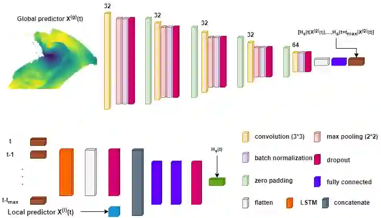 翻译:海洋波浪气候对近岸和近海人类活动有重大影响,其特征化有助于设计海洋结构,如波能转换器和海上潜水器。因此,工程师需要长期的海洋波参数序列。数字模型是海洋波数据的宝贵来源,但计算成本很高。因此,近几十年来,统计和数据驱动方法越来越受关注。这项工作利用两阶段深学习模型,调查北大西洋风与比斯卡湾岸外地点高浪(Hs)之间的时空关系。第一步利用进化神经网络(CNNs)提取有助于Hs的空间特征。随后,长期短期记忆(LSTM)用于了解风与波之间的长期时间依赖性。