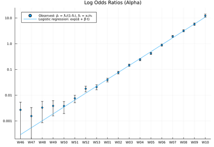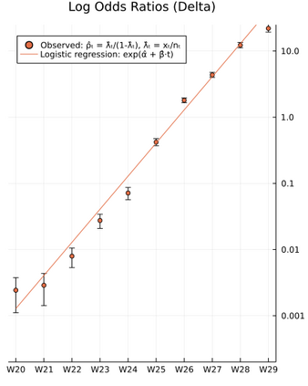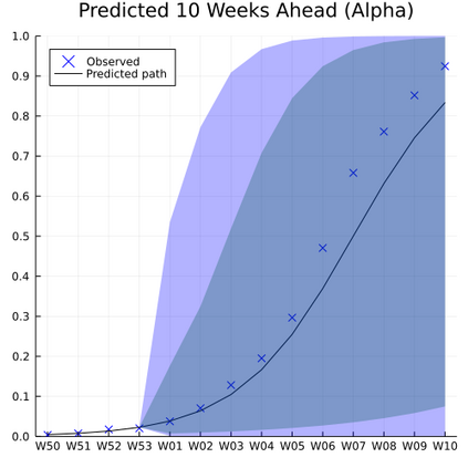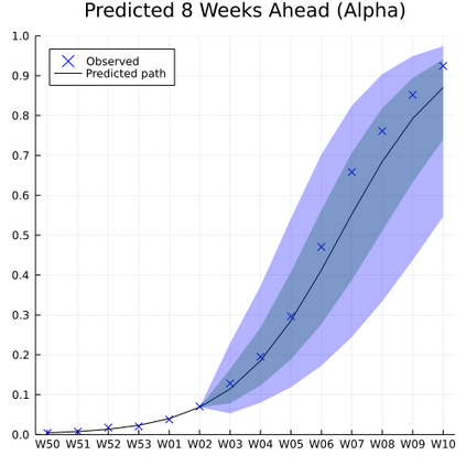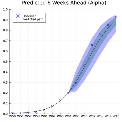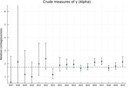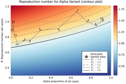 翻译:我们提出一个简单的动态模型来估计两种病毒变异的相对传染性。最大可能性估计和推论在抽样期内容易改变病例总数,并可以作为一种后勤倒退来表示。我们利用丹麦周报数据估计SARS-COV-2的阿尔法变体,以将复制数比祖传变体增加1.51倍[CI 95%:1.50,1.53]。三角洲变体将复制数比阿尔法变异体增加2.17倍[CI :1.99, 2.36],比祖传变体增加3.28倍[CI:95%,3.01,3.58]。预测新出现的病毒变异体的比例是直接向前的,我们继续显示如何在没有当代顺序结果的情况下估计新变异体的有效复制数。这对实时评估该大流行病的状况很有帮助,因为我们用阿尔法变体的推断有效复制数来进行实验性说明。