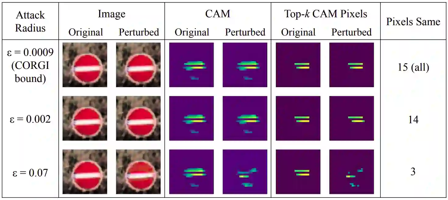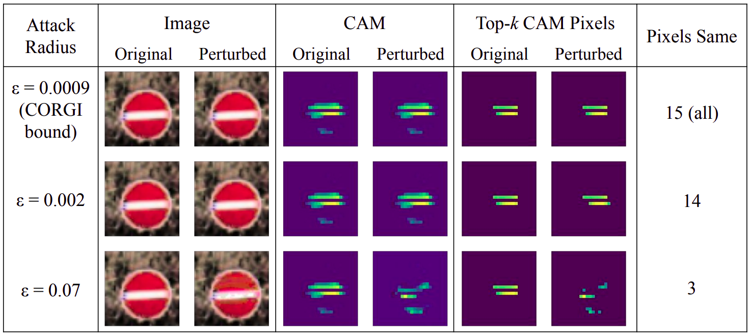 Interpreting machine learning models is challenging but crucial for ensuring the safety of deep networks in autonomous driving systems. Due to the prevalence of deep learning based perception models in autonomous vehicles, accurately interpreting their predictions is crucial. While a variety of such methods have been proposed, most are shown to lack robustness. Yet, little has been done to provide certificates for interpretability robustness. Taking a step in this direction, we present CORGI, short for Certifiably prOvable Robustness Guarantees for Interpretability mapping. CORGI is an algorithm that takes in an input image and gives a certifiable lower bound for the robustness of the top k pixels of its CAM interpretability map. We show the effectiveness of CORGI via a case study on traffic sign data, certifying lower bounds on the minimum adversarial perturbation not far from (4-5x) state-of-the-art attack methods.