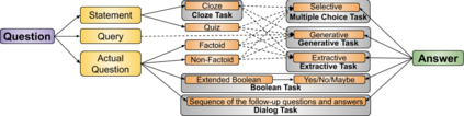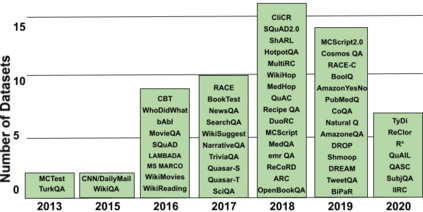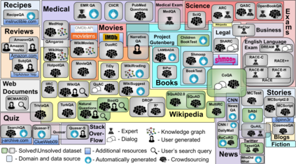 翻译:本文调查了60个英文机器阅读理解数据集,目的是为关注这一问题的其他研究人员提供方便的资源。 我们根据数据集的问答形式进行分类,并在各层面进行比较,包括大小、词汇、数据来源、创建方法、人类性能水平和第一个问题词。 我们的分析显示维基百科是迄今为止最常见的数据源,相对缺乏为什么、何时、在哪里跨数据集的问题。
