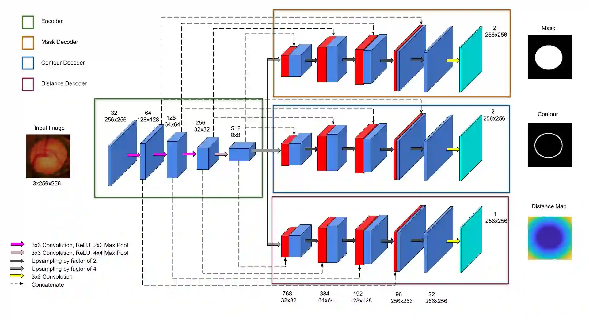 Medical image segmentation is a primary task in many applications, and the accuracy of the segmentation is a necessity. Recently, many deep learning networks derived from U-Net have been extensively used and have achieved notable results. To further improve and refine the performance of U-Net, parallel decoders along with mask prediction decoder have been carried out and have shown significant improvement with additional advantages. In our work, we utilize the advantages of using a combination of contour and distance map as regularizers. In turn, we propose a novel architecture Psi-Net with a single encoder and three parallel decoders, one decoder to learn the mask and other two to learn the auxiliary tasks of contour detection and distance map estimation. The learning of these auxiliary tasks helps in capturing the shape and boundary. We also propose a new joint loss function for the proposed architecture. The loss function consists of a weighted combination of Negative likelihood and Mean Square Error loss. We have used two publicly available datasets: 1) Origa dataset for the task of optic cup and disc segmentation and 2) Endovis segment dataset for the task of polyp segmentation to evaluate our model. We have conducted extensive experiments using our network to show our model gives better results in terms of segmentation, boundary and shape metrics.