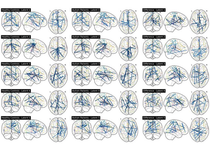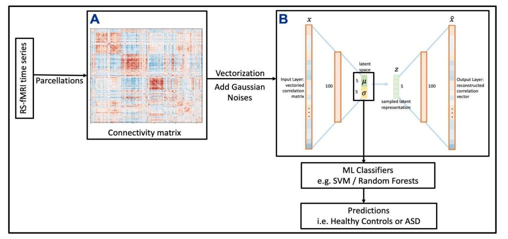 Autism spectrum disorders (ASDs) are developmental conditions characterized by restricted interests and difficulties in communication. The complexity of ASD has resulted in a deficiency of objective diagnostic biomarkers. Deep learning methods have gained recognition for addressing these challenges in neuroimaging analysis, but finding and interpreting such diagnostic biomarkers are still challenging computationally. Here, we propose a feature reduction pipeline using resting-state fMRI data. We used Craddock atlas and Power atlas to extract functional connectivity data from rs-fMRI, resulting in over 30 thousand features. By using a denoising variational autoencoder, our proposed pipeline further compresses the connectivity features into 5 latent Gaussian distributions, providing is a low-dimensional representation of the data to promote computational efficiency and interpretability. To test the method, we employed the extracted latent representations to classify ASD using traditional classifiers such as SVM on a large multi-site dataset. The 95% confidence interval for the prediction accuracy of SVM is [0.63, 0.76] after site harmonization using the extracted latent distributions. Without using DVAE for dimensionality reduction, the prediction accuracy is 0.70, which falls within the interval. The DVAE successfully encoded the diagnostic information from rs-fMRI data without sacrificing prediction performance. The runtime for training the DVAE and obtaining classification results from its extracted latent features was 7 times shorter compared to training classifiers directly on the raw data. Our findings suggest that the Power atlas provides more effective brain connectivity insights for diagnosing ASD than Craddock atlas. Additionally, we visualized the latent representations to gain insights into the brain networks contributing to the differences between ASD and neurotypical brains.