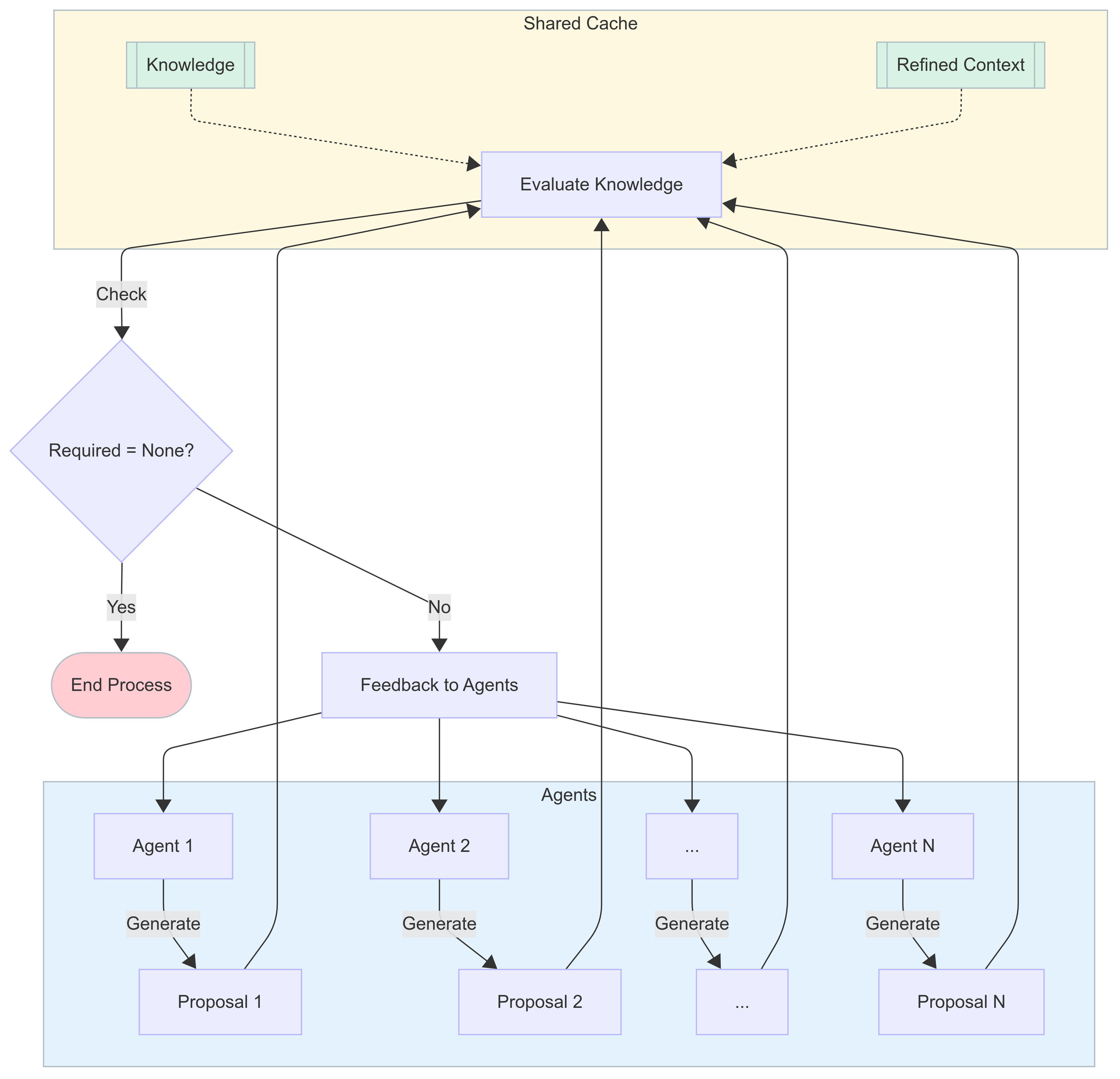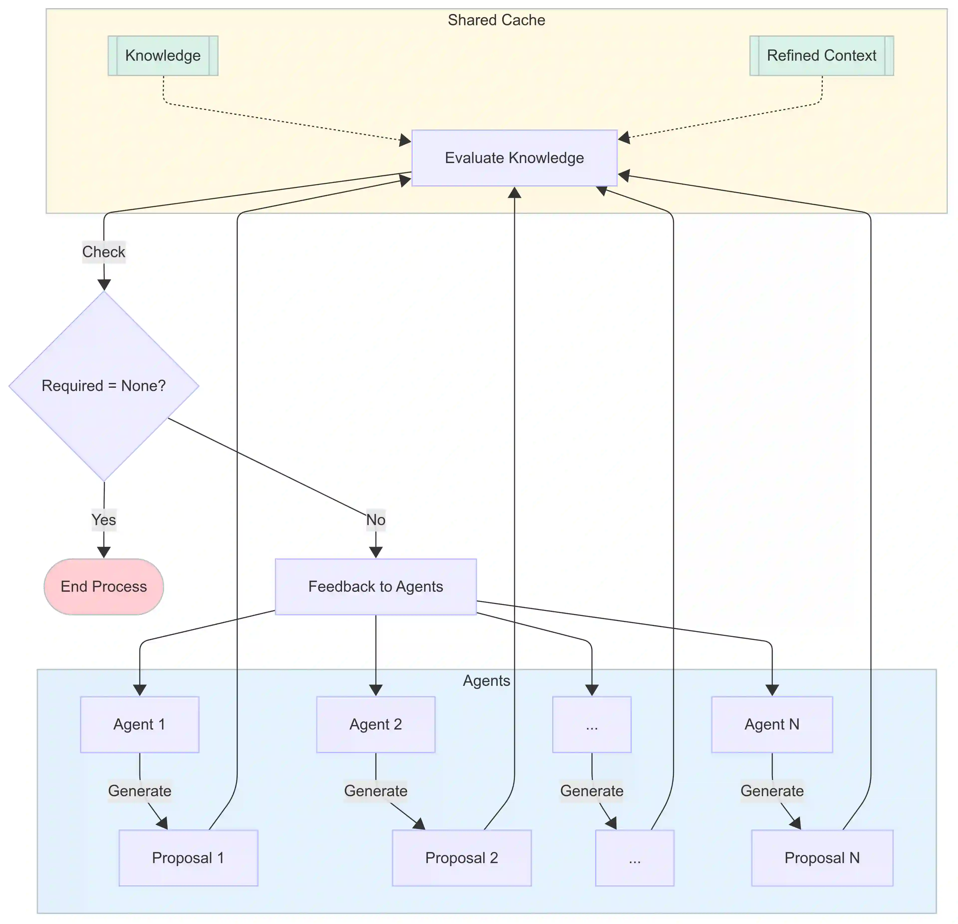 We introduce a novel large language model (LLM)-driven agent framework, which iteratively refines queries and filters contextual evidence by leveraging dynamically evolving knowledge. A defining feature of the system is its decoupling of external sources from an internal knowledge cache that is progressively updated to guide both query generation and evidence selection. This design mitigates bias-reinforcement loops and enables dynamic, trackable search exploration paths, thereby optimizing the trade-off between exploring diverse information and maintaining accuracy through autonomous agent decision-making. Our approach is evaluated on a broad range of open-domain question answering benchmarks, including multi-step tasks that mirror real-world scenarios where integrating information from multiple sources is critical, especially given the vulnerabilities of LLMs that lack explicit reasoning or planning capabilities. The results show that the proposed system not only outperforms single-step baselines regardless of task difficulty but also, compared to conventional iterative retrieval methods, demonstrates pronounced advantages in complex tasks through precise evidence-based reasoning and enhanced efficiency. The proposed system supports both competitive and collaborative sharing of updated context, enabling multi-agent extension. The benefits of multi-agent configurations become especially prominent as task difficulty increases. The number of convergence steps scales with task difficulty, suggesting cost-effective scalability.
