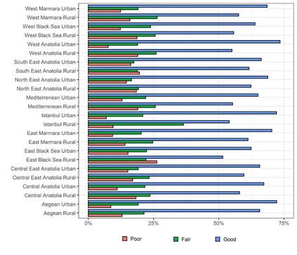 This study is concerned with the analysis of three-level ordinal outcome data with polytomous logistic regression in the presence of random-effects. It is assumed that the random-effects follow a Bridge distribution for the logit link, which allows one to obtain marginal interpretations of the regression coefficients. The data are obtained from the Turkish Income and Living Conditions Study, where the outcome variable is self-rated health (SRH), which is ordinal in nature. The analysis of these data is to compare covariate sub-groups and draw region- and family-level inferences in terms of SRH. Parameters and random-effects are sampled from the joint posterior densities following a Bayesian paradigm. Three criteria are used for model selection: Watenable information criterion, log pseudo marginal likelihood, and deviance information criterion. All three suggest that we need to account for both region- and family-level variabilities in order to model SRH. The extent to which the models replicate the observed data is examined by posterior predictive checks. Differences in SRH are found between levels of economic and demographic variables, regions of Turkey, and families who participated in the survey. Some of the interesting findings are that unemployed people are 19% more likely to report poorer health than employed people, and rural Aegean is the region that has the least probability of reporting poorer health.