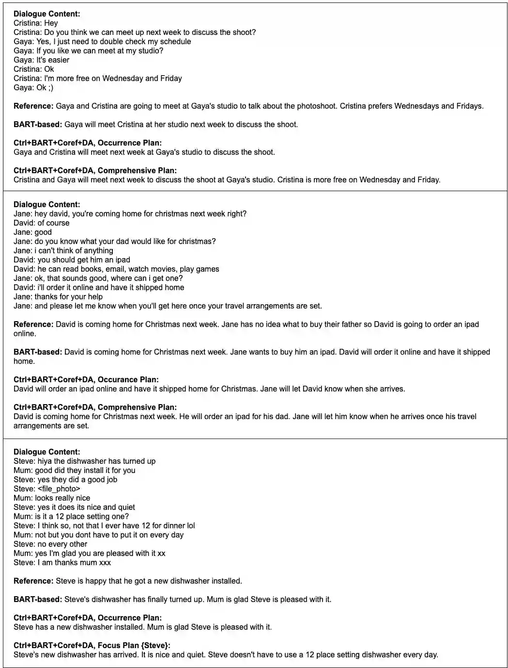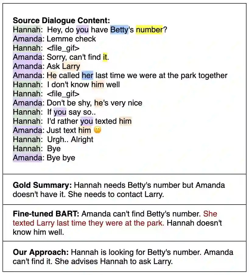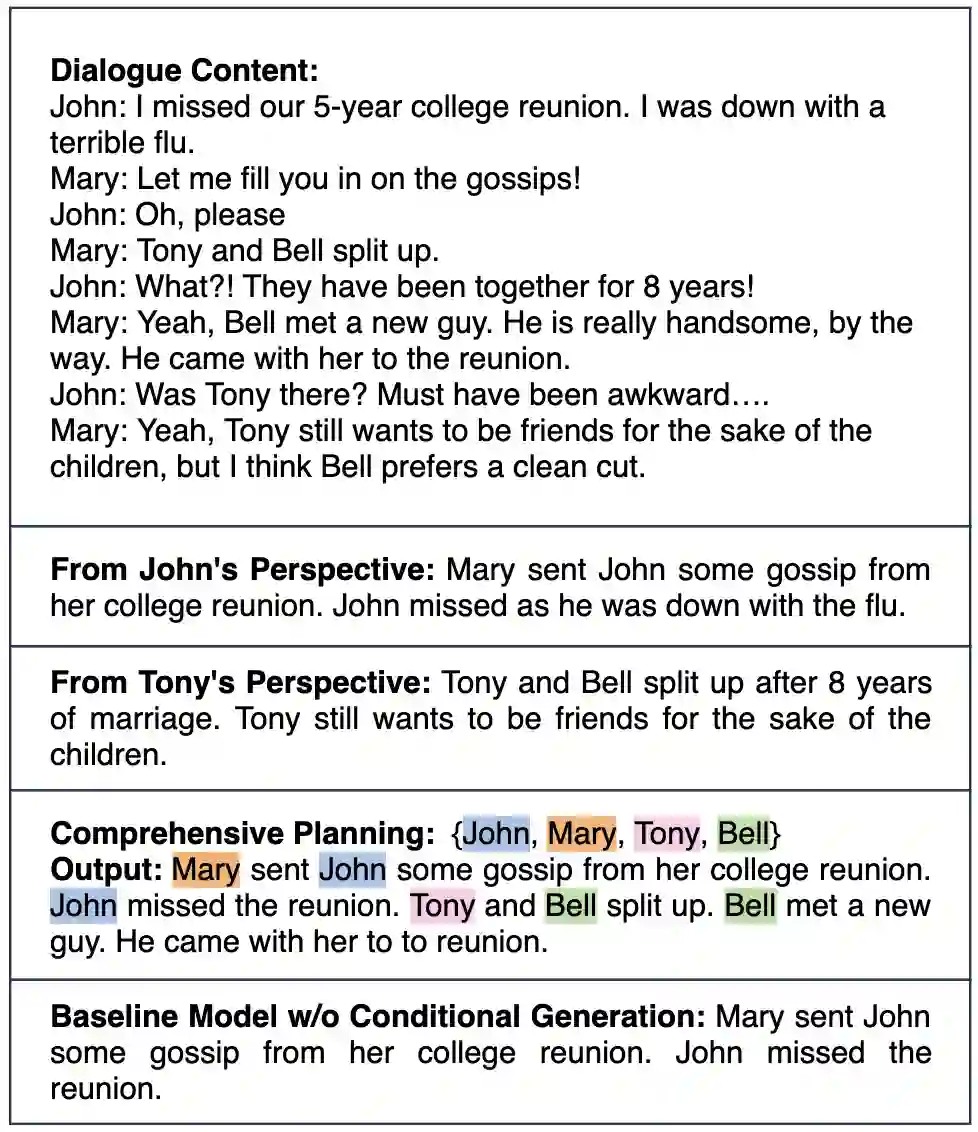 翻译:在本文中,我们提议一个可控制的神经生成框架,可灵活地指导对话与个人名称实体规划的总结; 有条件的顺序经过调整,以决定在制定摘要以解决总体任务中受限制不足的问题时,应侧重于何种类型的信息或观点; 这一框架支持两类使用案例:(1) 全面视角,这是一个没有用户首选的通用案例,考虑到所有对话者及所有被提及人员的简要观点;(2) 焦点视角,将摘要定位于用户指定的个人名称实体,该实体可以是对话者或对话中提及的人之一;在培训期间,我们利用个人名称实体的发生规划,并参考信息,以提高时间的一致性,尽量减少神经生成过程中的幻觉;实验结果显示,我们提议的框架在各种规划控制下,利用客观指标和人力评价,生成流畅和事实一致的摘要。