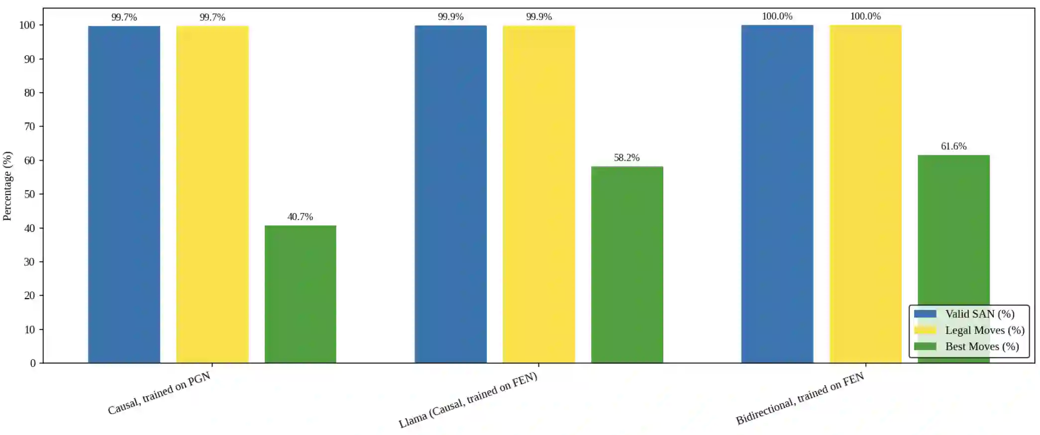 翻译:语言模型传统上围绕因果掩码设计。在具有空间或关系结构的领域中,因果掩码常被视为不适用,转而采用序列线性化方法。然而,对于在非序列数据上接受因果掩码引入的信息损失是否可行这一问题,目前鲜有直接研究,部分原因在于同时提供同一数据集的空间与序列表示的领域较少。本研究以国际象棋领域为例探讨此问题,该领域天然支持两种表示形式。我们训练了具有双向和因果自注意力机制的语言模型,分别处理空间(基于棋盘状态)和序列(基于走棋顺序)数据。结果表明,在空间棋盘状态上训练的模型——即使采用因果掩码——始终比基于序列数据训练的模型表现出更强的对弈能力。虽然实验在国际象棋领域进行,但我们的结论具有方法论意义,可能产生更广泛的影响:对空间数据应用因果掩码是训练单模态大语言模型处理空间数据的可行方案,在某些领域甚至优于序列化方法。