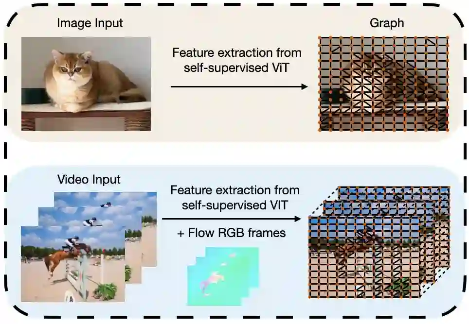 In this paper, we describe a graph-based algorithm that uses the features obtained by a self-supervised transformer to detect and segment salient objects in images and videos. With this approach, the image patches that compose an image or video are organised into a fully connected graph, where the edge between each pair of patches is labeled with a similarity score between patches using features learned by the transformer. Detection and segmentation of salient objects is then formulated as a graph-cut problem and solved using the classical Normalized Cut algorithm. Despite the simplicity of this approach, it achieves state-of-the-art results on several common image and video detection and segmentation tasks. For unsupervised object discovery, this approach outperforms the competing approaches by a margin of 6.1%, 5.7%, and 2.6%, respectively, when tested with the VOC07, VOC12, and COCO20K datasets. For the unsupervised saliency detection task in images, this method improves the score for Intersection over Union (IoU) by 4.4%, 5.6% and 5.2%. When tested with the ECSSD, DUTS, and DUT-OMRON datasets, respectively, compared to current state-of-the-art techniques. This method also achieves competitive results for unsupervised video object segmentation tasks with the DAVIS, SegTV2, and FBMS datasets.