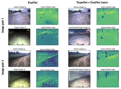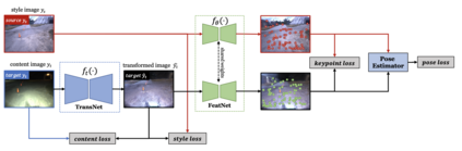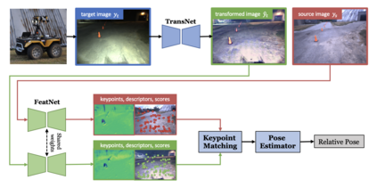 Long-term visual localization is an essential problem in robotics and computer vision, but remains challenging due to the environmental appearance changes caused by lighting and seasons. While many existing works have attempted to solve it by directly learning invariant sparse keypoints and descriptors to match scenes, these approaches still struggle with adverse appearance changes. Recent developments in image transformations such as neural style transfer have emerged as an alternative to address such appearance gaps. In this work, we propose to combine an image transformation network and a feature-learning network to improve long-term localization performance. Given night-to-day image pairs, the image transformation network transforms the night images into day-like conditions prior to feature matching; the feature network learns to detect keypoint locations with their associated descriptor values, which can be passed to a classical pose estimator to compute the relative poses. We conducted various experiments to examine the effectiveness of combining style transfer and feature learning and its training strategy, showing that such a combination greatly improves long-term localization performance.