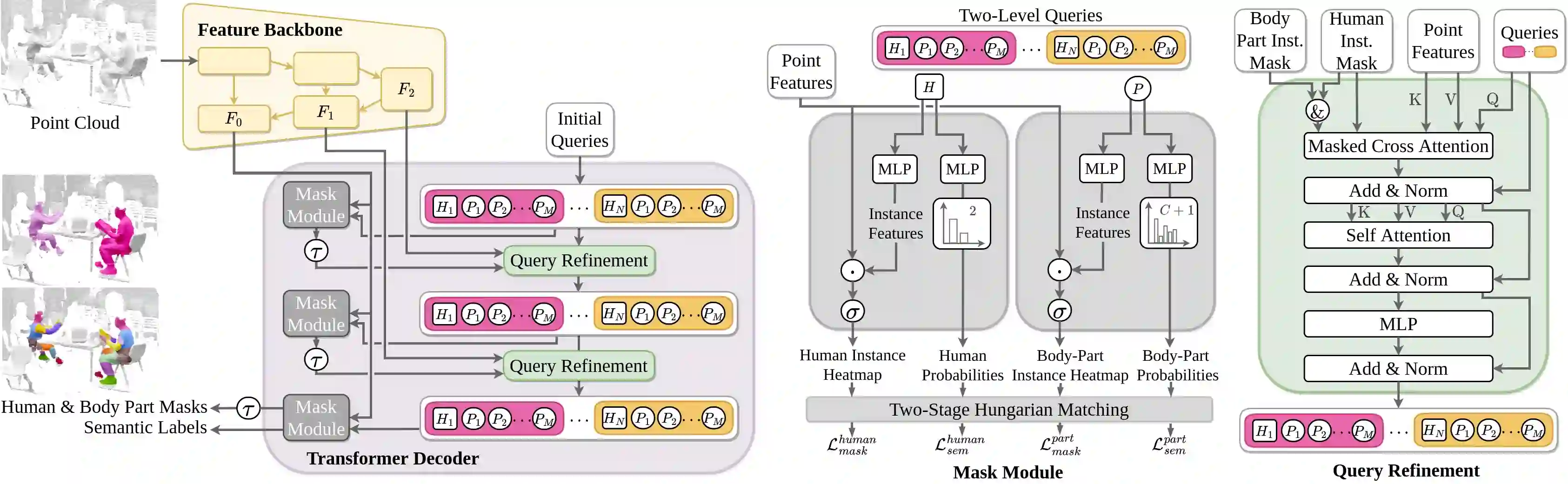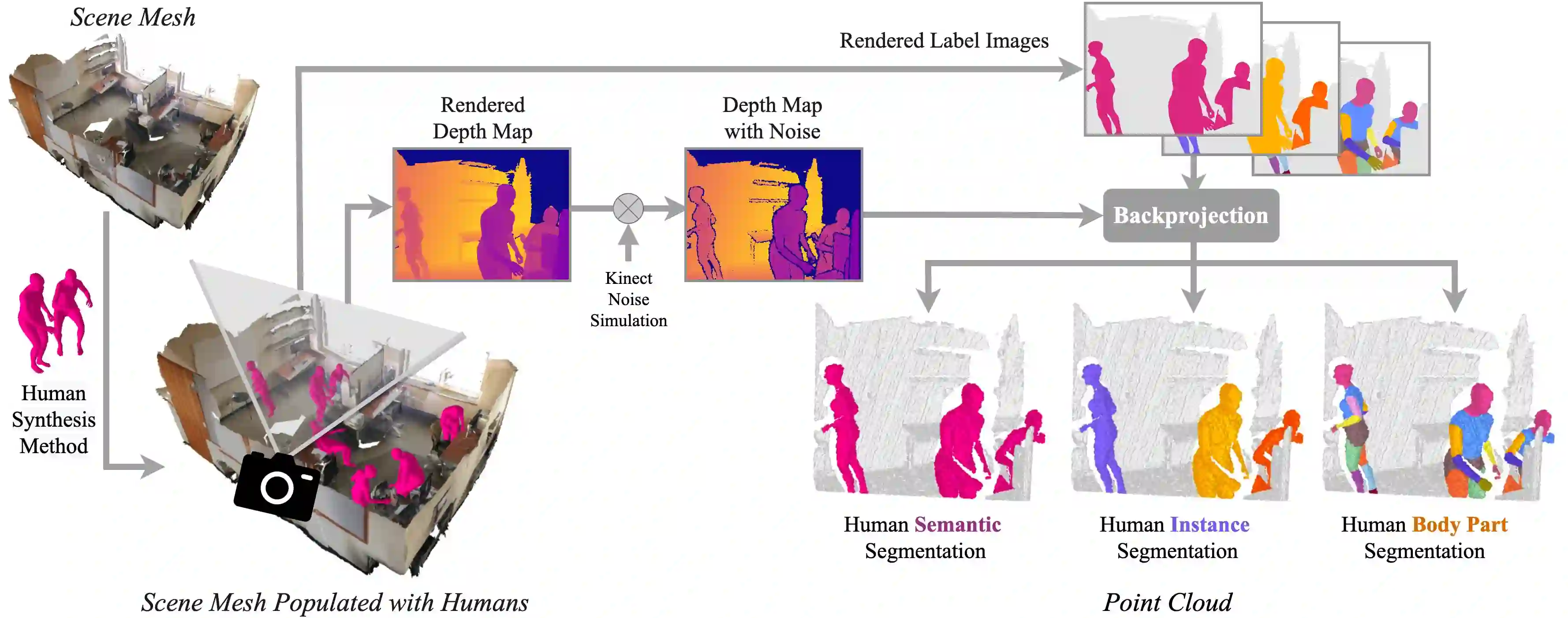 Segmenting humans in 3D indoor scenes has become increasingly important with the rise of human-centered robotics and AR/VR applications. In this direction, we explore the tasks of 3D human semantic-, instance- and multi-human body-part segmentation. Few works have attempted to directly segment humans in point clouds (or depth maps), which is largely due to the lack of training data on humans interacting with 3D scenes. We address this challenge and propose a framework for synthesizing virtual humans in realistic 3D scenes. Synthetic point cloud data is attractive since the domain gap between real and synthetic depth is small compared to images. Our analysis of different training schemes using a combination of synthetic and realistic data shows that synthetic data for pre-training improves performance in a wide variety of segmentation tasks and models. We further propose the first end-to-end model for 3D multi-human body-part segmentation, called Human3D, that performs all the above segmentation tasks in a unified manner. Remarkably, Human3D even outperforms previous task-specific state-of-the-art methods. Finally, we manually annotate humans in test scenes from EgoBody to compare the proposed training schemes and segmentation models.