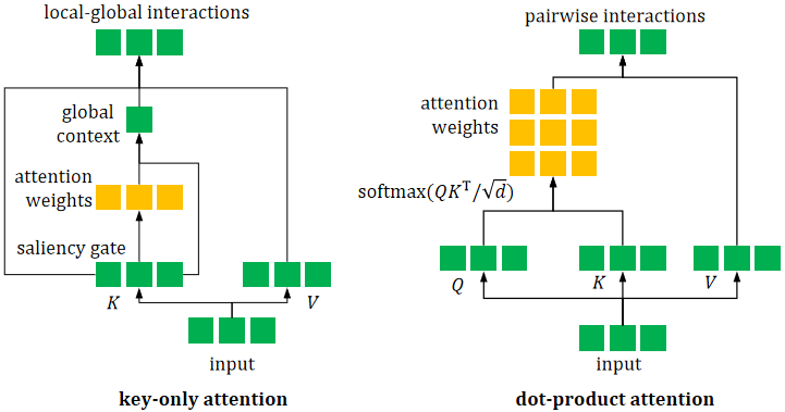 Vision Transformers have achieved state-of-the-art performance in many visual tasks. Due to the quadratic computational and memory complexities of self-attention, recent works either apply attention only to low-resolution inputs or restrict the receptive field to a small local region. To overcome these limitations, we propose key-only attention, which excludes query-key pairwise interactions and uses a compute-efficient saliency-gate to obtain attention weights, modeling local-global interactions in all stages. Key-only attention has linear computational and memory complexities w.r.t input size. We use alternate layout to hybridize convolution and attention layers instead of grafting which is suggested by previous works, so that all stages can benefit from both spatial attentions and convolutions. We leverage these improvements to develop a new self-attention model family, LinGlos, which reach state-of-the-art accuracies on the parameter-limited setting of ImageNet classification benchmark, and outperform baselines significantly in downstream tasks, e.g., COCO object detection and ADE20K semantic segmentation.