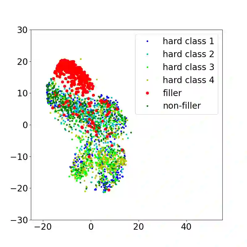 翻译:填充词(例如“嗯”或“啊”)在自然语言中经常出现。自动检测然后去除这些词语对于提高录音的流畅度、自信心和专业性是有益的。但相比于其他硬类别,“填充词”更难以识别。本文提出了一种新的填充词检测方法,通过动态添加辅助类别和应用额外的类别内焦点损失来解决这个问题。辅助类别会促使模型针对硬类别进行明确建模。类别内焦点损失还会自适应地调整“填充词”和“非填充词”类别之间的惩罚权重,以解决在“非填充词”类别中剩余的其他混淆词语。我们的方法在PodcastFillers数据集上取得了最佳效果,并相较于其他方法有了巨大的提升。