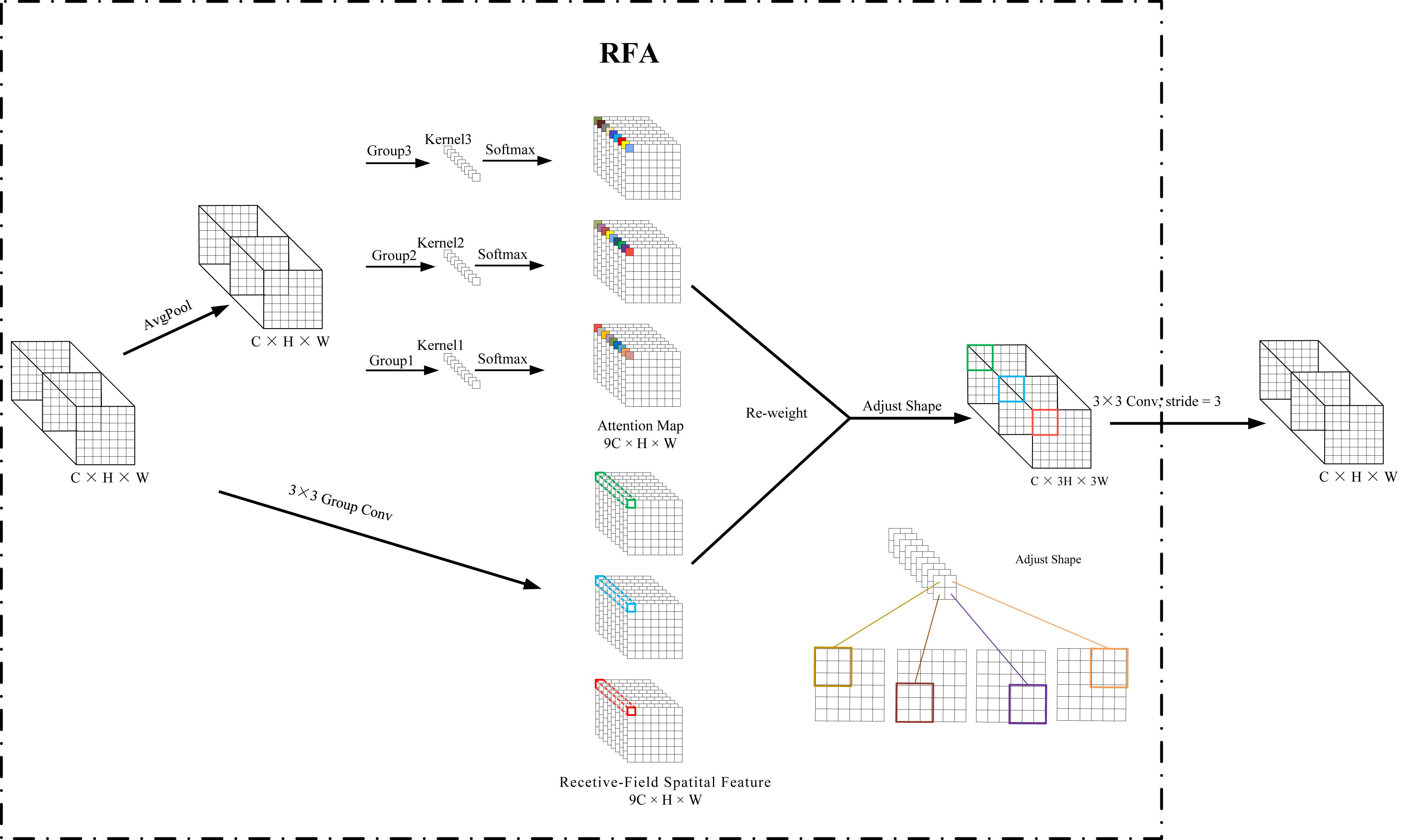 翻译:空间注意力机制被广泛应用于改善卷积神经网络的性能。但是,它也存在一定的局限性。本文提出了一种关于空间注意力机制有效性的新观点:空间注意力机制本质上是解决卷积核参数共享的问题。然而,空间注意力机制生成的注意力图所包含的信息对于大尺寸的卷积核来说并不充足。因此,我们提出了一种新的注意力机制,名为感受野注意力机制(Receptive-Field Attention,简称 RFA)。现有的空间注意力机制,如卷积块注意力模块(Convolutional Block Attention Module,简称 CBAM)和协同注意力(Coordinated Attention,简称 CA),仅关注空间特征,不能完全解决卷积核参数共享的问题。相比之下,RFA不仅关注感受野空间特征,并且为大尺寸卷积核提供了有效的注意力权重。由 RFA 所开发的感受野注意力卷积操作(RFAConv)代表了一种替代标准卷积操作的新方法。它在几乎不增加计算成本和参数的同时,极大地提高了网络的性能。我们在 ImageNet-1k、COCO 和 VOC 数据集上进行了一系列实验,以证明我们方法的优越性。特别重要的是,我们认为现在是时候将注意力机制的重点从空间特征转移到感受野空间特征上了。通过这种方式,我们可以进一步提高网络性能,取得更好的结果。相关任务的代码和预训练模型可在 https://github.com/Liuchen1997/RFAConv 找到。