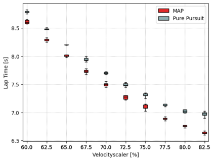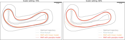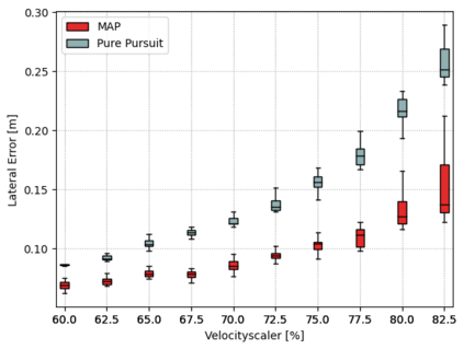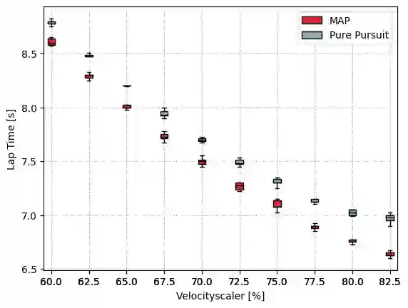 翻译:自主赛是一个研究领域,越来越受欢迎,因为它将自主驾驶算法推向极限,并成为通用自主驾驶的催化剂。对于规模化自动赛车平台,计算限制和复杂性往往限制模型预测控制(MPC)的使用。因此,几何控制器是最经常部署的控制器。它们证明在产生执行和操作简单性的同时,它们表现良好。然而,它们本身缺乏模型动态,因而将赛车限制在可以忽略轮胎滑漏的高速域。本文展示了基于模型和加速追踪的高性能模型轨迹跟踪算法(MAP),在利用轮胎动态的同时保持几何方法的简单性。提议的算法使得能够准确跟踪与最先进的(SotA)测地控制器相比前所未有的速度的轨迹。MAP控制器是实验性验证的,在横向追踪错误方面比参考几何控制器差四倍,导致在测试速度至11米时的跟踪误差为0.055米。