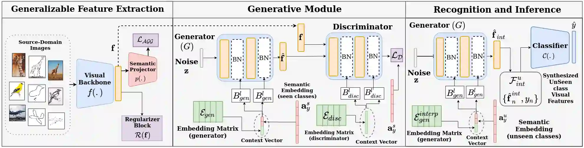 Recent progress towards designing models that can generalize to unseen domains (i.e domain generalization) or unseen classes (i.e zero-shot learning) has embarked interest towards building models that can tackle both domain-shift and semantic shift simultaneously (i.e zero-shot domain generalization). For models to generalize to unseen classes in unseen domains, it is crucial to learn feature representation that preserves class-level (domain-invariant) as well as domain-specific information. Motivated from the success of generative zero-shot approaches, we propose a feature generative framework integrated with a COntext COnditional Adaptive (COCOA) Batch-Normalization to seamlessly integrate class-level semantic and domain-specific information. The generated visual features better capture the underlying data distribution enabling us to generalize to unseen classes and domains at test-time. We thoroughly evaluate and analyse our approach on established large-scale benchmark - DomainNet and demonstrate promising performance over baselines and state-of-art methods.