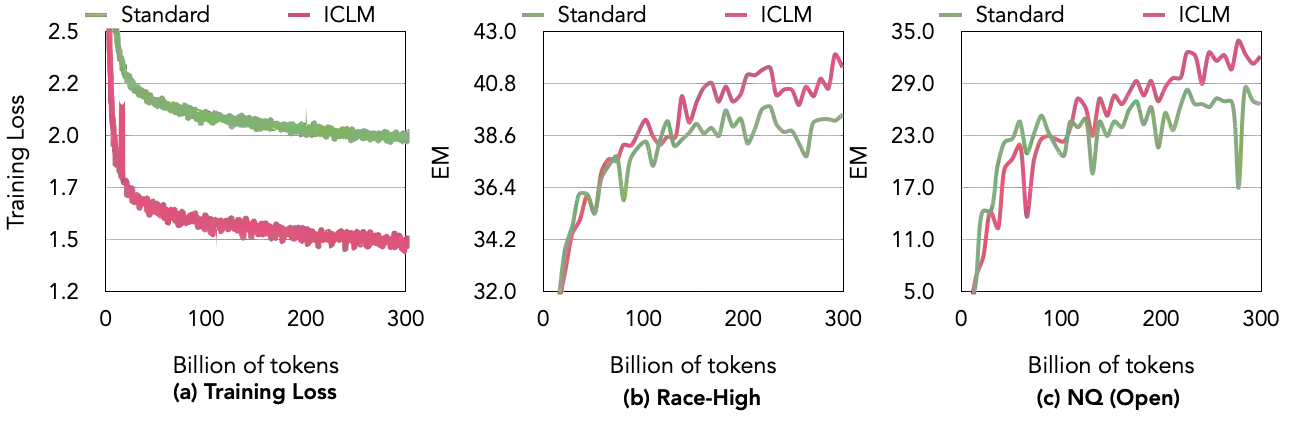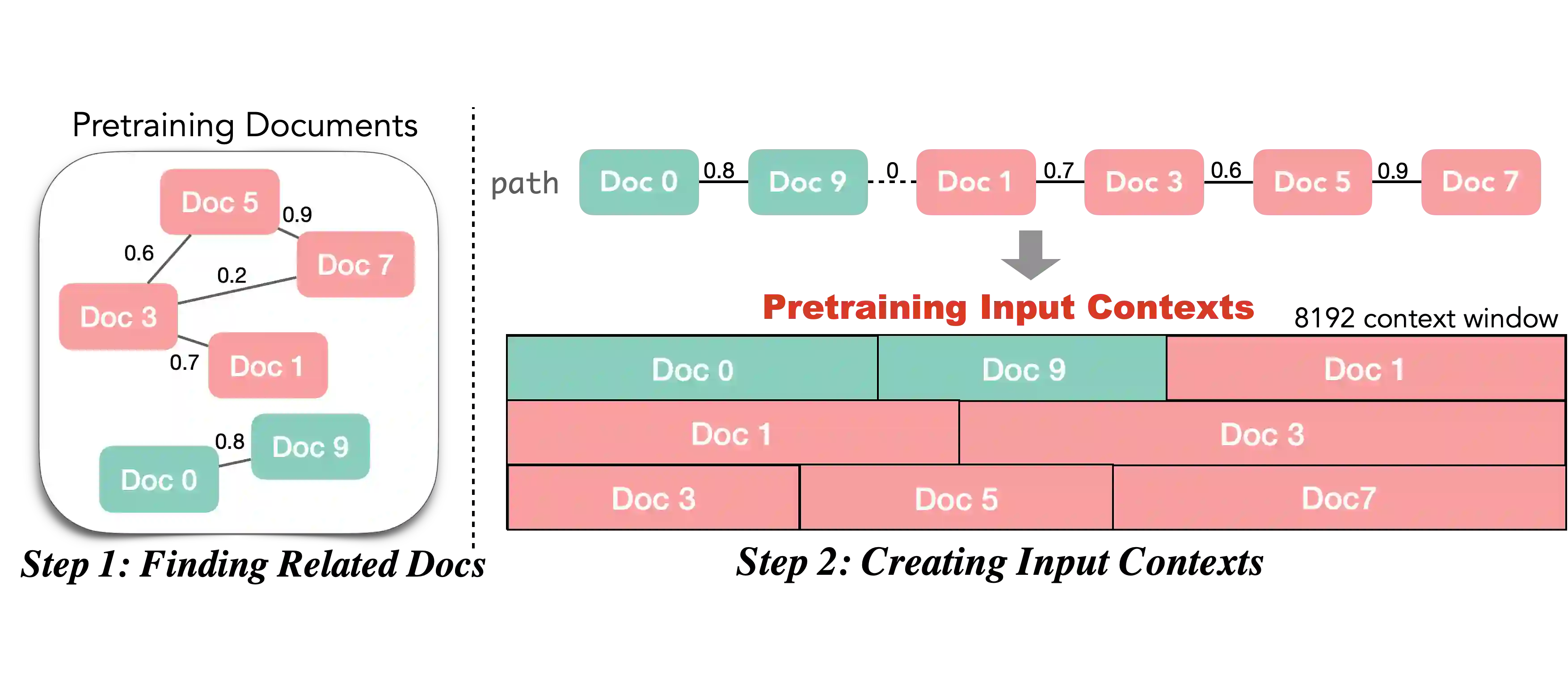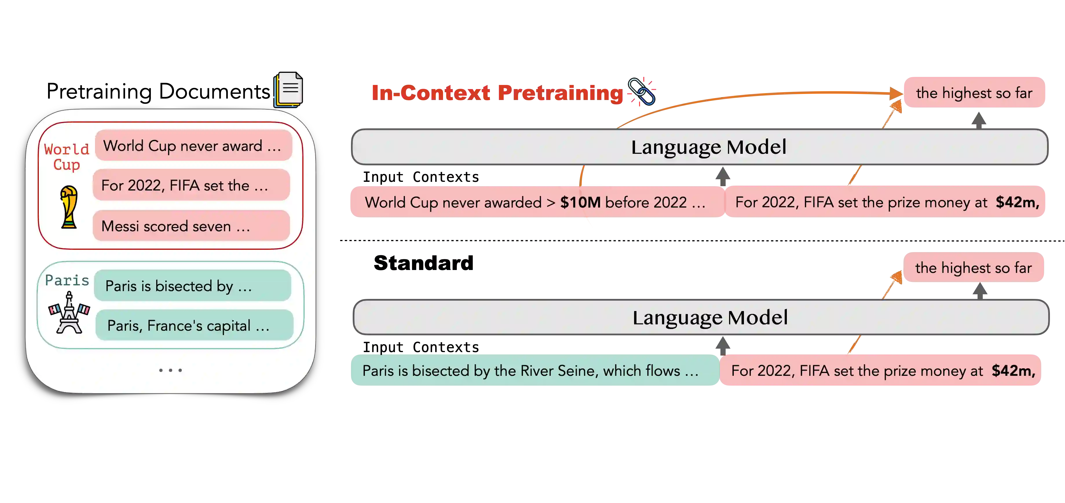 Large language models (LMs) are currently trained to predict tokens given document prefixes, enabling them to directly perform long-form generation and prompting-style tasks which can be reduced to document completion. Existing pretraining pipelines train LMs by concatenating random sets of short documents to create input contexts but the prior documents provide no signal for predicting the next document. We instead present In-Context Pretraining, a new approach where language models are pretrained on a sequence of related documents, thereby explicitly encouraging them to read and reason across document boundaries. We can do In-Context Pretraining by simply changing the document ordering so that each context contains related documents, and directly applying existing pretraining pipelines. However, this document sorting problem is challenging. There are billions of documents and we would like the sort to maximize contextual similarity for every document without repeating any data. To do this, we introduce approximate algorithms for finding related documents with efficient nearest neighbor search and constructing coherent input contexts with a graph traversal algorithm. Our experiments show In-Context Pretraining offers a simple and scalable approach to significantly enhance LMs'performance: we see notable improvements in tasks that require more complex contextual reasoning, including in-context learning (+8%), reading comprehension (+15%), faithfulness to previous contexts (+16%), long-context reasoning (+5%), and retrieval augmentation (+9%).