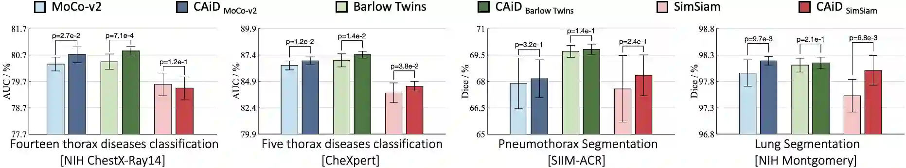 翻译:最近,自我监督的实例歧视方法在从未贴标签的图片中学习视觉表现方面取得了显著的成功,然而,鉴于照片和医疗图像之间的显著差异,在医学成像中,以实例为基础的目标的效力,侧重于学习图像中最具歧视性的全球特征(即自行车车轮),在医学成像方面仍不为人所知。我们的初步分析表明,医学图像在解剖学方面全球高度相似性妨碍了案例歧视方法,以捕捉一系列不同特征,对其在医疗下游任务方面的表现产生消极影响。为了减轻这一限制,我们开发了一个简单而有效的自我监督框架,称为“环境-Aware 实例歧视 ” (CAiD)。 CaiD的目标是通过提供从多种未贴标签的医疗图像当地背景中编码的精细和更具歧视性的信息来改进实例学习。我们从三个角度进行系统分析,以调查所学的医学成像的实用性:(i) 普遍性和可转移性,(ii) 嵌入空间的可复制性,以及(iii) 重新启用性。我们的广泛实验表明,CA(1) 将现有背景分析性特征与背景分析性图像进行充分比较;(2) 分析性分析方法改进。