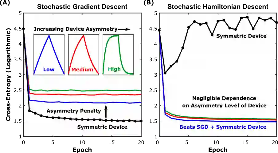 翻译:由可编程的非挥发性抵抗器组成的模拟横条阵列正在深入调查中,以加速深神经网络培训。然而,对实际抗力装置进行无处不在的不对称行为调节,严重降低了经过常规算法培训的网络的分类性能。在这里,我们描述并实验性地展示了一种完全平行培训的替代算法:斯托切斯·汉密尔顿派后裔。这种方法不是常规地调整错误函数梯度方向的重量,而是将包含装置不对称效应的系统的总能量(Hamiltonian)控制在网络参数上,以成功最小化。我们提供了关键直觉,说明为什么设备不对称从根本上与常规培训算法不兼容,以及新方法如何将它作为一种有用的特性加以利用。我们的技术使得能够立即实现基于现成的装置技术的模拟深度学习加速器。