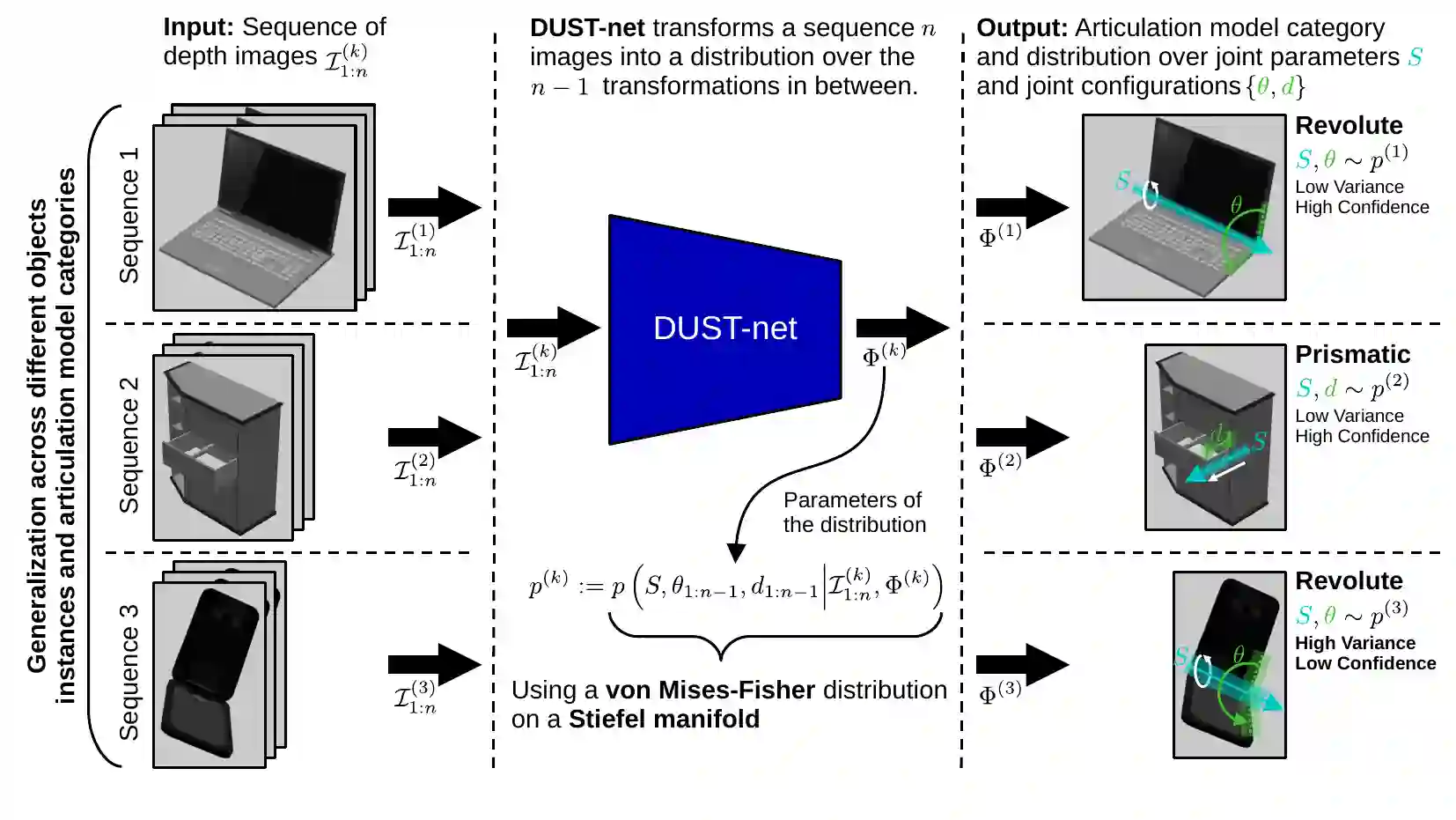 We propose a method that efficiently learns distributions over articulation model parameters directly from depth images without the need to know articulation model categories a priori. By contrast, existing methods that learn articulation models from raw observations typically only predict point estimates of the model parameters, which are insufficient to guarantee the safe manipulation of articulated objects. Our core contributions include a novel representation for distributions over rigid body transformations and articulation model parameters based on screw theory, von Mises-Fisher distributions, and Stiefel manifolds. Combining these concepts allows for an efficient, mathematically sound representation that implicitly satisfies the constraints that rigid body transformations and articulations must adhere to. Leveraging this representation, we introduce a novel deep learning based approach, DUST-net, that performs category-independent articulation model estimation while also providing model uncertainties. We evaluate our approach on several benchmarking datasets and real-world objects and compare its performance with two current state-of-the-art methods. Our results demonstrate that DUST-net can successfully learn distributions over articulation models for novel objects across articulation model categories, which generate point estimates with better accuracy than state-of-the-art methods and effectively capture the uncertainty over predicted model parameters due to noisy inputs.