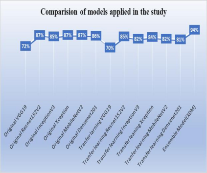 Pneumonia, a respiratory infection brought on by bacteria or viruses, affects a large number of people, especially in developing and impoverished countries where high levels of pollution, unclean living conditions, and overcrowding are frequently observed, along with insufficient medical infrastructure. Pleural effusion, a condition in which fluids fill the lung and complicate breathing, is brought on by pneumonia. Early detection of pneumonia is essential for ensuring curative care and boosting survival rates. The approach most usually used to diagnose pneumonia is chest X-ray imaging. The purpose of this work is to develop a method for the automatic diagnosis of bacterial and viral pneumonia in digital x-ray pictures. This article first presents the authors' technique, and then gives a comprehensive report on recent developments in the field of reliable diagnosis of pneumonia. In this study, here tuned a state-of-the-art deep convolutional neural network to classify plant diseases based on images and tested its performance. Deep learning architecture is compared empirically. VGG19, ResNet with 152v2, Resnext101, Seresnet152, Mobilenettv2, and DenseNet with 201 layers are among the architectures tested. Experiment data consists of two groups, sick and healthy X-ray pictures. To take appropriate action against plant diseases as soon as possible, rapid disease identification models are preferred. DenseNet201 has shown no overfitting or performance degradation in our experiments, and its accuracy tends to increase as the number of epochs increases. Further, DenseNet201 achieves state-of-the-art performance with a significantly a smaller number of parameters and within a reasonable computing time. This architecture outperforms the competition in terms of testing accuracy, scoring 95%. Each architecture was trained using Keras, using Theano as the backend.