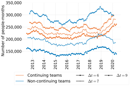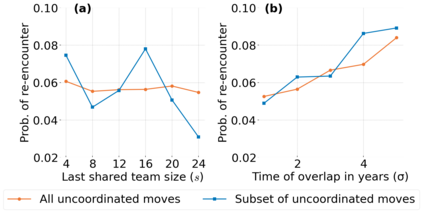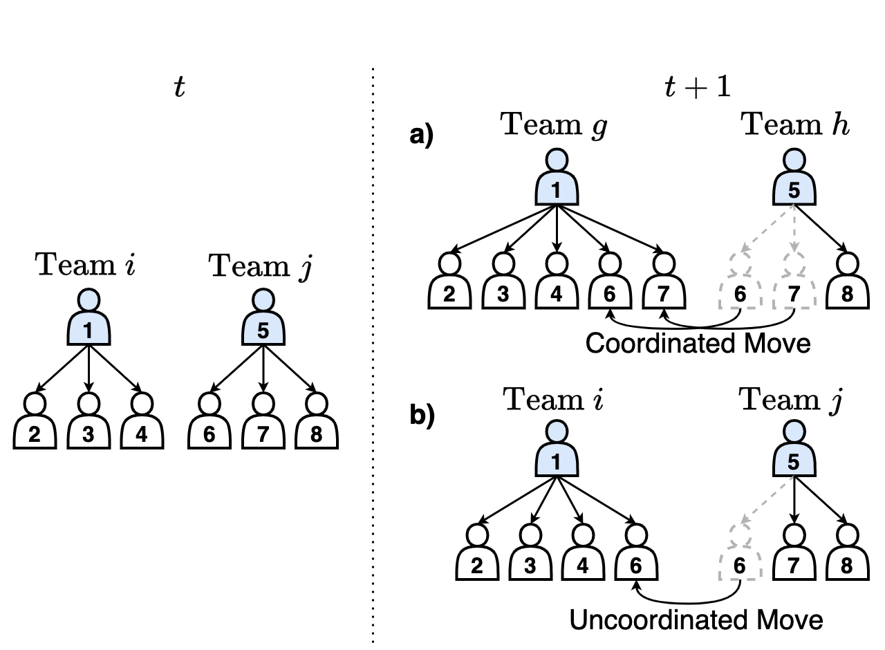 The internal structures of large organizations determine much of what occurs inside including the way in which tasks are performed, the workers that perform them, and the mobility of those workers within the organization. However, regarding this latter process, most of the theoretical and modeling approaches used to understand organizational worker mobility are highly stylized, using idealizations such as structureless organizations, indistinguishable workers, and a lack of social bonding of the workers. In this article, aided by a decade of precise, temporally resolved data of a large US government organization, we introduce a new model to describe organizations as composites of teams within which individuals perform specific tasks and where social connections develop. By tracking the personnel composition of organizational teams, we find that workers that change jobs are highly influenced by preferring to reunite with past co-workers. In this organization, 34\% of all moves lead to worker reunions, a percentage well-above expectation. We find that the greater the time workers spend together or the smaller the team they share both increase their likelihood to reunite, supporting the notion of increased familiarity and trust behind such reunions and the dominant role of social capital in the evolution of large organizations.