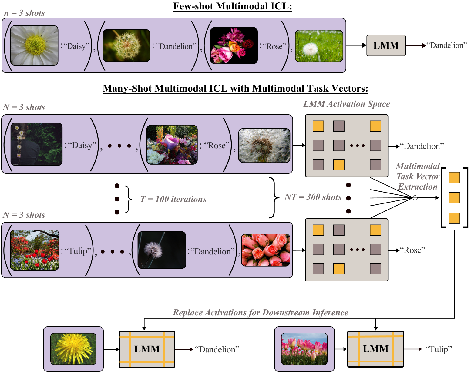 The recent success of interleaved Large Multimodal Models (LMMs) in few-shot learning suggests that in-context learning (ICL) with many examples can be promising for learning new tasks. However, this many-shot multimodal ICL setting has one crucial problem: it is fundamentally limited by the model's context length set at pretraining. The problem is especially prominent in the multimodal domain, which processes both text and images, requiring additional tokens. This motivates the need for a multimodal method to compress many shots into fewer tokens without finetuning. In this work, we enable LMMs to perform multimodal, many-shot in-context learning by leveraging Multimodal Task Vectors (MTV)--compact implicit representations of in-context examples compressed in the model's attention heads. Specifically, we first demonstrate the existence of such MTV in LMMs and then leverage these extracted MTV to enable many-shot in-context learning for various vision-and-language tasks. Our experiments suggest that MTV can scale in performance with the number of compressed shots and generalize to similar out-of-domain tasks without additional context length for inference.