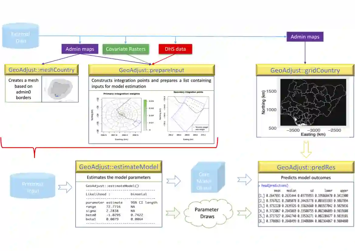 翻译:本文介绍了R包GeoAdjust https://github.com/umut-altay/GeoAdjust-package,该包使用模板模型构建器(TMB)实现了快速的经验贝叶斯地统计推断,支持来自人口和健康调查项目(DHS)的家庭调查数据。 DHS家庭调查数据是跟踪人口和健康指标的重要数据来源,但故意引入了GPS坐标的位置不确定性以保护隐私。 GeoAdjust在包含空间随机效应和栅格和距离为基础的协变量的地统计模型中考虑这种位置的不确定性。该R包支持具有恒等链,logit链和log链函数的高斯,二项式和泊松似然函数。用户通过设置少量函数参数来定义所需的模型结构,并可以轻松尝试不同的超参数。GeoAdjust是第一个专门设计用于解决点参考家庭调查数据GPS坐标的位置不确定性的软件包。该软件包提供了对模型参数的推断,并可以在未观测到的位置上预测值。