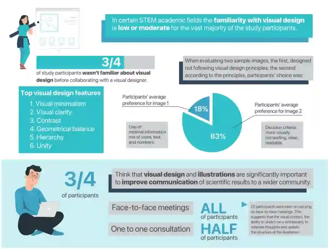Visual representations are becoming important in science communication and education. This explorative study investigates the perception of STEM researchers, without any specific visual design background, and the value of visual representations as tools to support the communication of technical and scientific knowledge among academics and a wider non-technical community. Early findings show that visual representations can positively support scientists to share research outcomes in a more compelling, visually clear, and impactful manner, reaching a wider audience across different disciplines.