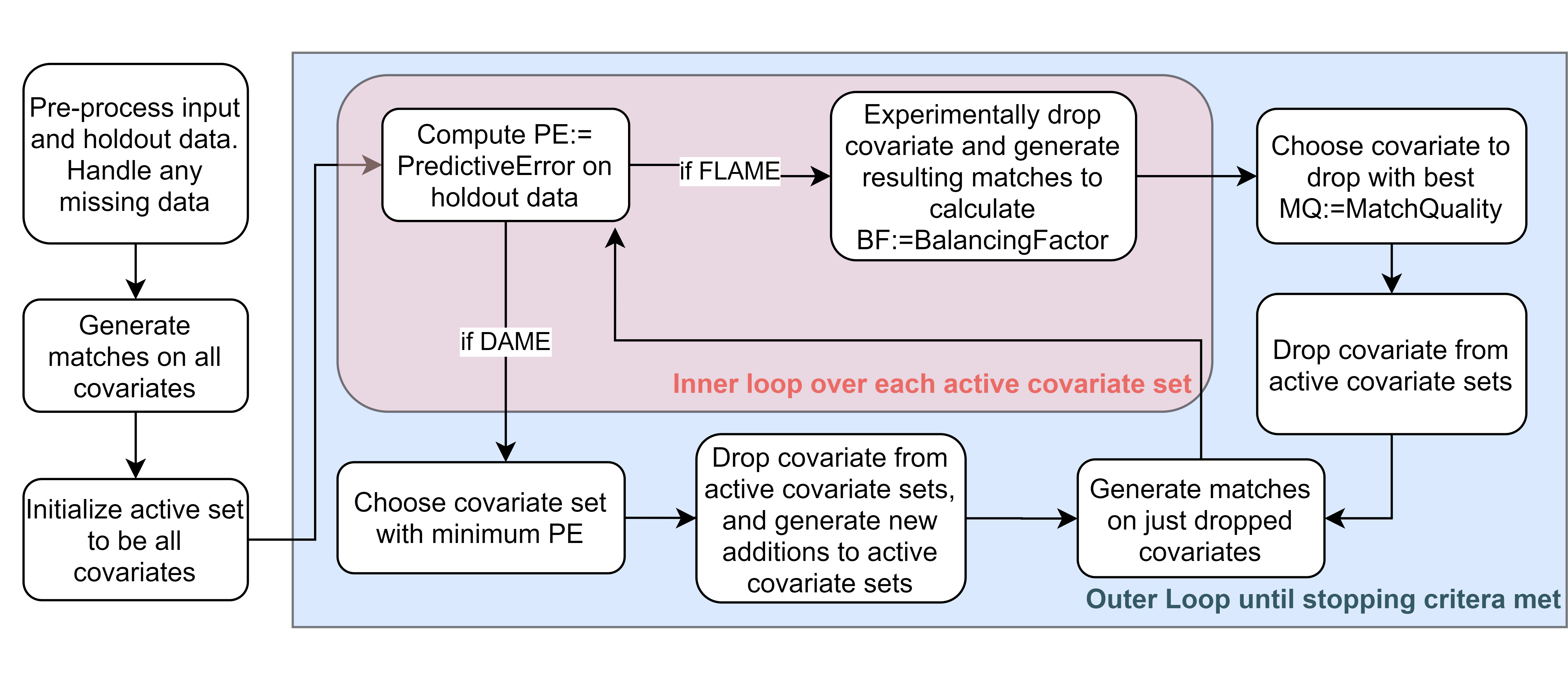 dame-flame is a Python package for performing matching for observational causal inference on datasets containing discrete covariates. This package implements the Dynamic Almost Matching Exactly (DAME) and Fast Large-Scale Almost Matching Exactly (FLAME) algorithms, which match treatment and control units on subsets of the covariates. The resulting matched groups are interpretable, because the matches are made on covariates (rather than, for instance, propensity scores), and high-quality, because machine learning is used to determine which covariates are important to match on. DAME solves an optimization problem that matches units on as many covariates as possible, prioritizing matches on important covariates. FLAME approximates the solution found by DAME via a much faster backward feature selection procedure. The package provides several adjustable parameters to adapt the algorithms to specific applications, and can calculate treatment effects after matching. Descriptions of these parameters, details on estimating treatment effects, and further examples, can be found in the documentation at https://almost-matching-exactly.github.io/DAME-FLAME-Python-Package/