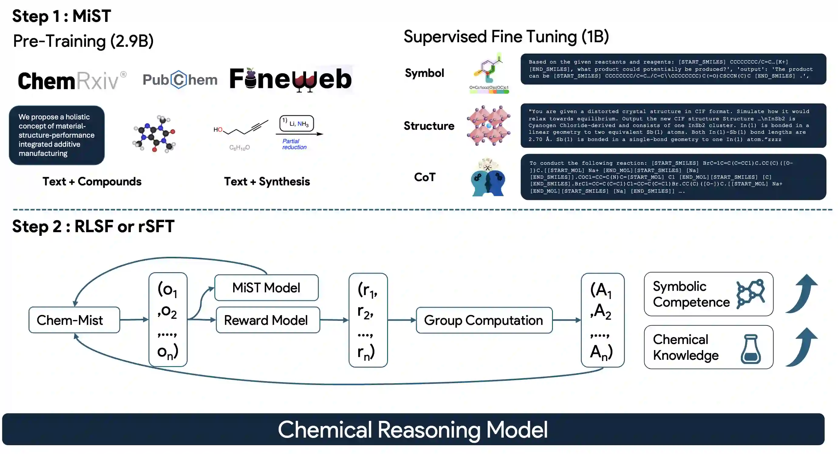 翻译:大型语言模型可以通过基于规则的奖励进行在线微调来发展推理能力。然而,最近的研究揭示了一个关键限制:仅当基础模型已经为正确答案分配了不可忽略的概率时——我们称之为“潜在可解性”——强化学习才能成功。本研究探讨了化学推理能力的出现以及这些先决条件对化学意味着什么。我们确定了基于强化学习的化学推理的两个必要条件:1)符号能力,以及2)潜在化学知识。我们提出了中期科学训练(MiST):一套满足这些条件的中期训练技术,包括采用SMILES/CIF感知预处理的数据混合、对29亿词元的持续预训练以及对10亿词元的有监督微调。这些步骤将30亿和70亿参数模型的潜在可解性分数提高了高达1.8倍,并使强化学习能够将有机反应命名的Top-1准确率从10.9%提升至63.9%,将无机材料生成的准确率从40.6%提升至67.4%。在其他具有挑战性的化学任务中也观察到了类似的结果,同时生成了可解释的推理轨迹。我们的研究结果为化学推理训练明确了先决条件,并凸显了中期训练在解锁推理能力方面更广泛的作用。
