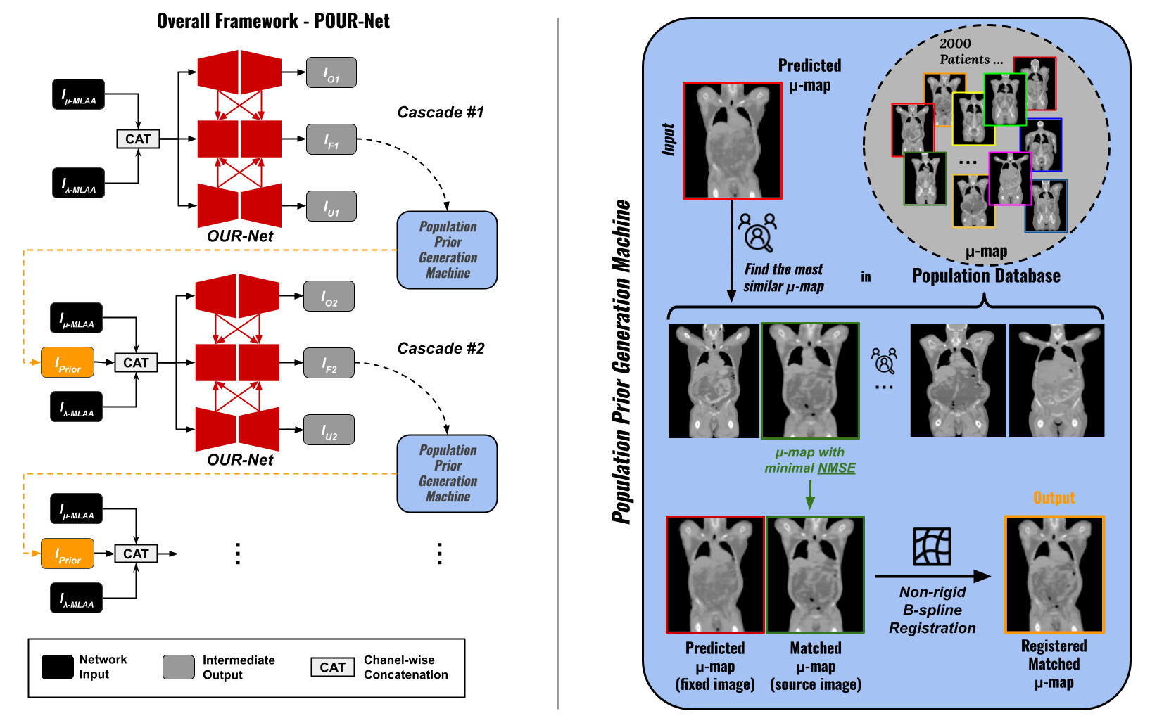 Low-dose PET offers a valuable means of minimizing radiation exposure in PET imaging. However, the prevalent practice of employing additional CT scans for generating attenuation maps (u-map) for PET attenuation correction significantly elevates radiation doses. To address this concern and further mitigate radiation exposure in low-dose PET exams, we propose POUR-Net - an innovative population-prior-aided over-under-representation network that aims for high-quality attenuation map generation from low-dose PET. First, POUR-Net incorporates an over-under-representation network (OUR-Net) to facilitate efficient feature extraction, encompassing both low-resolution abstracted and fine-detail features, for assisting deep generation on the full-resolution level. Second, complementing OUR-Net, a population prior generation machine (PPGM) utilizing a comprehensive CT-derived u-map dataset, provides additional prior information to aid OUR-Net generation. The integration of OUR-Net and PPGM within a cascade framework enables iterative refinement of $\mu$-map generation, resulting in the production of high-quality $\mu$-maps. Experimental results underscore the effectiveness of POUR-Net, showing it as a promising solution for accurate CT-free low-count PET attenuation correction, which also surpasses the performance of previous baseline methods.