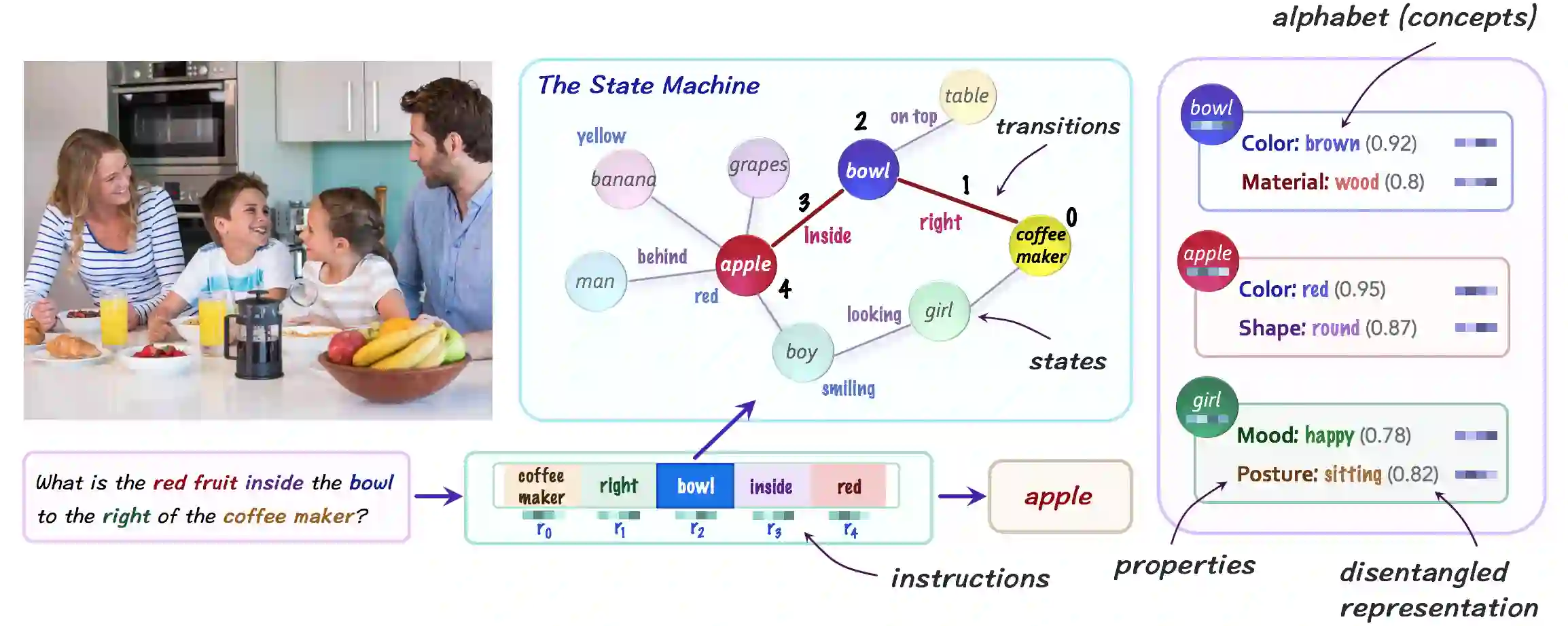 翻译:我们引入神经国家机器,试图弥合AI神经和象征观点之间的差距,并整合其与视觉推理任务之间的互补优势。根据图像,我们首先预测一个代表其基本语义和结构化世界模型的概率图。然后,我们对图形进行顺序推理,反复地穿行其节点以回答一个特定问题或得出新的推理。与大多数旨在与原始感官数据密切互动的神经结构形成对比,我们模型在抽象的潜在空间运作,将视觉和语言模式转化为基于语义概念的表达方式,从而提高透明度和模块性。我们评估了我们关于VQA-CP和GQA的模型,最近两个VQA数据集涉及构成性、多步推论和不同推理技巧,在两种情况下都取得了最新推理结果。我们提供了进一步实验,以说明模型在多个层面的强大概括能力,包括新概念的构成、答案分布的变化以及不可见的语言结构,展示了我们方法的素质和效力。