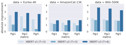 翻译:极端多标签文本分类 (XMC) 旨在将每个输入文本标记为来自极大标签组的最相关标签,例如产品分类和电子商务建议中出现的标签。最近,诸如BERT等预先培训的语言代表模型在一系列广泛的NLP任务中取得了显著的最新性能,包括小标签组(通常少于千人)的判刑分类。事实上,在应用BERT到 XMC 问题上存在若干挑战。主要的挑战有:(一) 很难从一个极大标签组中获取最相关的标签的可靠性和相关性,例如产品分类和电子商务建议。最近,BERT等预先培训的语言代表模型的大小可能非常大和范围。为了克服这些挑战,我们提出了X-BERT模型的首次可能的微调模型,用于对 XMC 问题进行扩缩的解决方案。具体地,X-BERT 将标签和文档文本的改进用于构建标签的升级,这会使标签群集的改进达到更精确的等级,以便更精确的标签组别具有更精确的可靠性。在模型上, 5-BER 数据库的内,最后的内, 正在将一个较精确的顺序关系中,而BERBILILIL 。