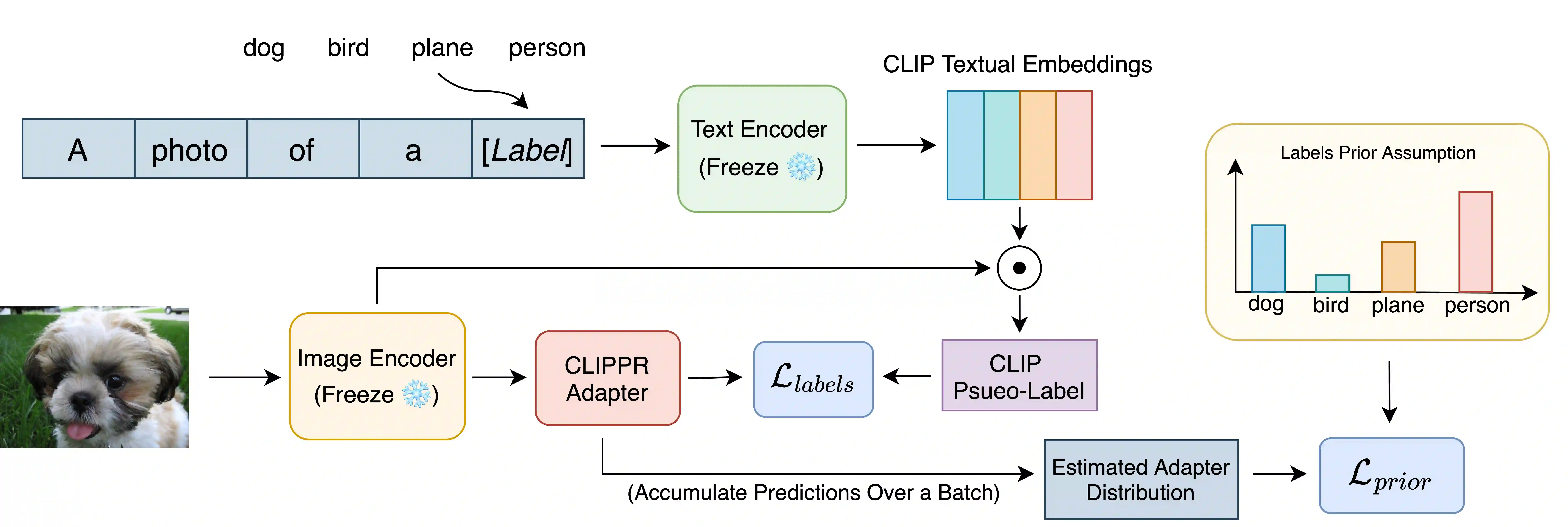 Labeling large image datasets with attributes such as facial age or object type is tedious and sometimes infeasible. Supervised machine learning methods provide a highly accurate solution, but require manual labels which are often unavailable. Zero-shot models (e.g., CLIP) do not require manual labels but are not as accurate as supervised ones, particularly when the attribute is numeric. We propose a new approach, CLIPPR (CLIP with Priors), which adapts zero-shot models for regression and classification on unlabelled datasets. Our method does not use any annotated images. Instead, we assume a prior over the label distribution in the dataset. We then train an adapter network on top of CLIP under two competing objectives: i) minimal change of predictions from the original CLIP model ii) minimal distance between predicted and prior distribution of labels. Additionally, we present a novel approach for selecting prompts for Vision & Language models using a distributional prior. Our method is effective and presents a significant improvement over the original model. We demonstrate an improvement of 28% in mean absolute error on the UTK age regression task. We also present promising results for classification benchmarks, improving the classification accuracy on the ImageNet dataset by 2.83%, without using any labels.