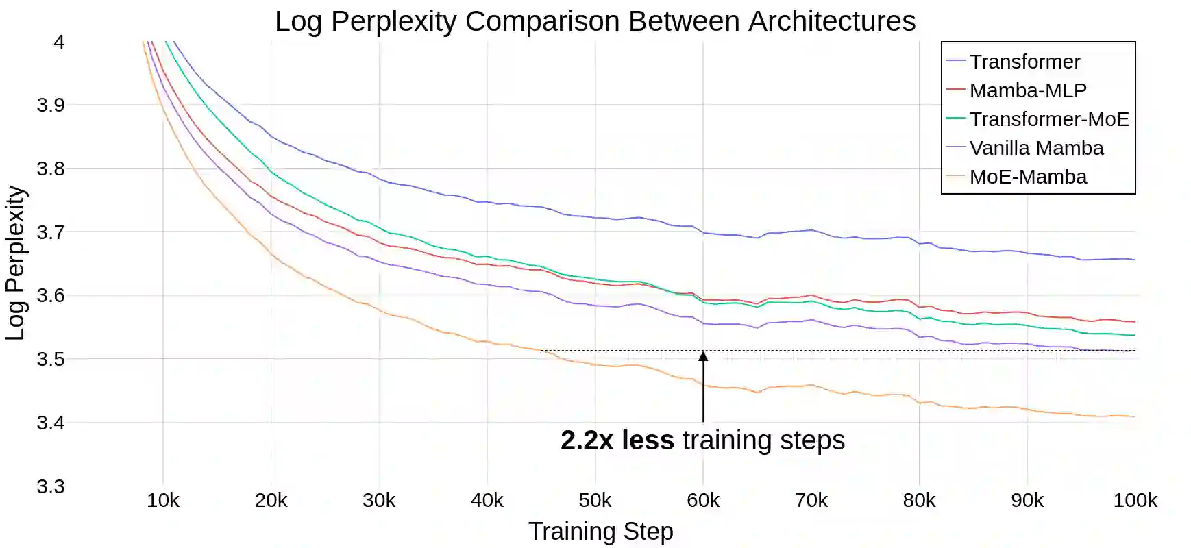 State Space Models (SSMs) have become serious contenders in the field of sequential modeling, challenging the dominance of Transformers. At the same time, Mixture of Experts (MoE) has significantly improved Transformer-based LLMs, including recent state-of-the-art open-source models. We propose that to unlock the potential of SSMs for scaling, they should be combined with MoE. We showcase this on Mamba, a recent SSM-based model that achieves remarkable, Transformer-like performance. Our model, MoE-Mamba, outperforms both Mamba and Transformer-MoE. In particular, MoE-Mamba reaches the same performance as Mamba in 2.2x less training steps while preserving the inference performance gains of Mamba against the Transformer.