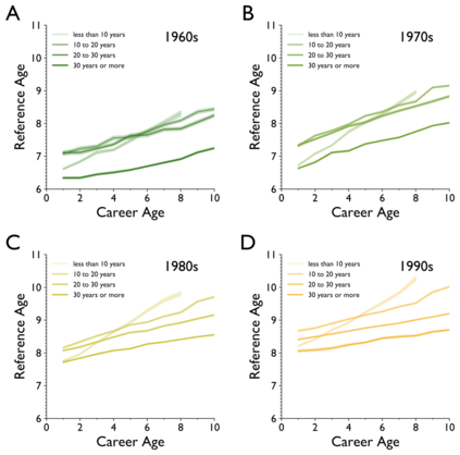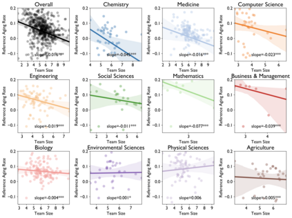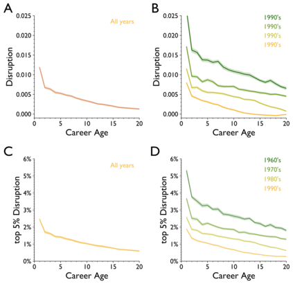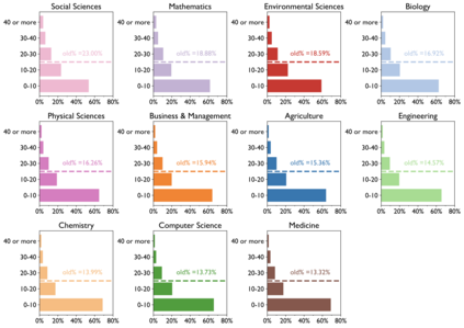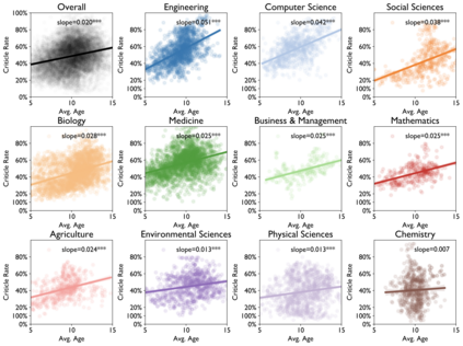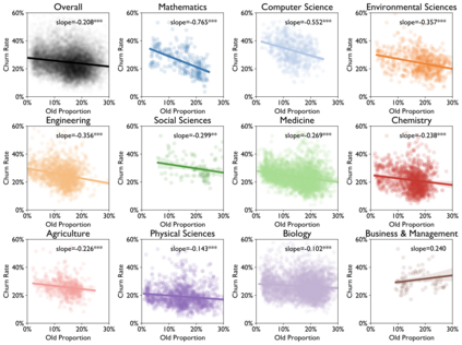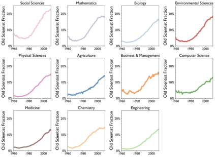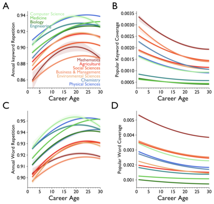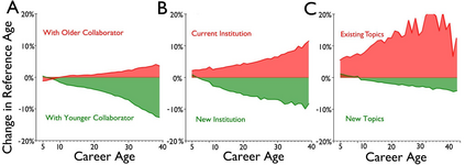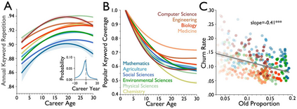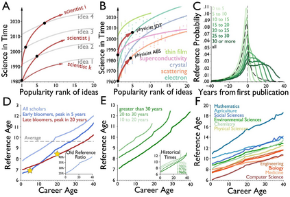 翻译:老龄化和科学进步性质之间的关系是什么? 先前的研究侧重于恒星科学家、其变化的日期和历史突破成功率。 在过去两个世纪里,我们对2.41亿篇文章的2.44亿学者进行了分析,我们发现,在所有领域、时期和影响水平、科学家研究想法和参考时间的年限上,他们的研究不太可能扰乱科学状态,更可能批评新兴工作。早期的成功加速了科学家老龄化;而不断改变的机构和领域以及同年轻科学家的合作则放慢了它的速度。这些模式汇集在领域内部,让那些年龄较大的科学家经历较低的想法和更快的个人老龄化,表明老龄化、活动和进步之间存在普遍联系。