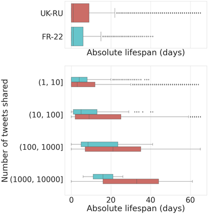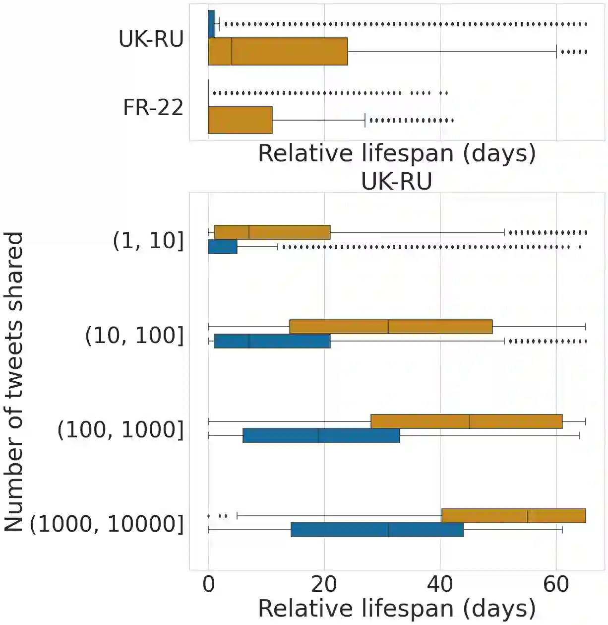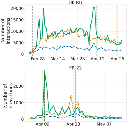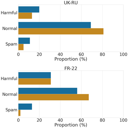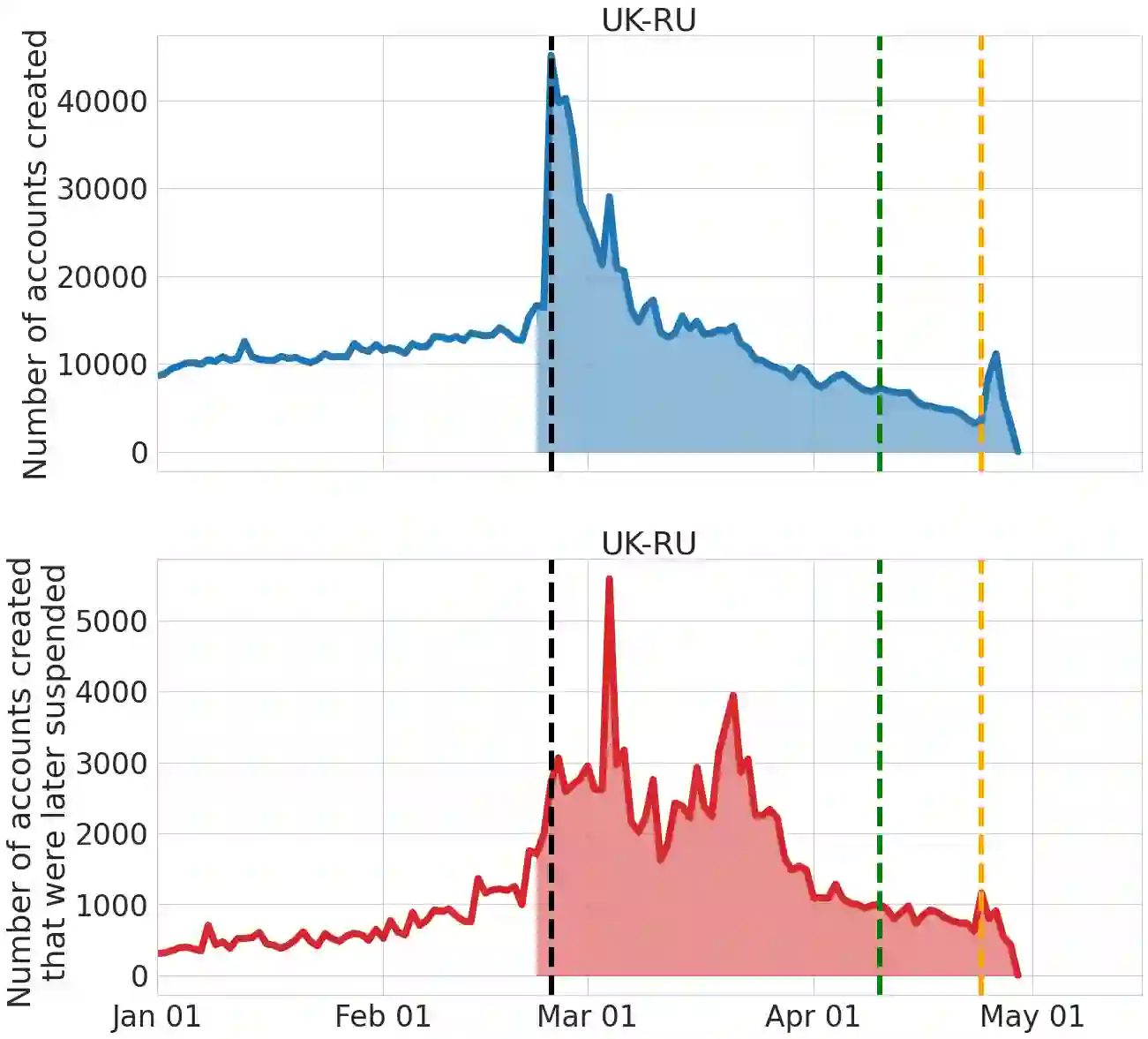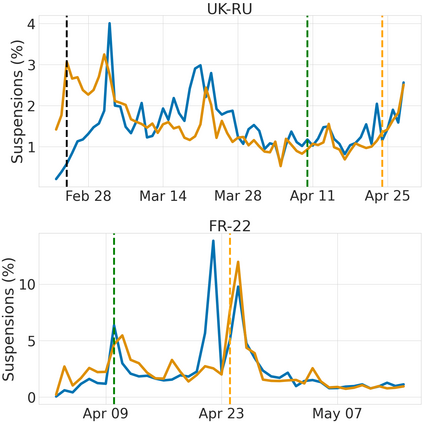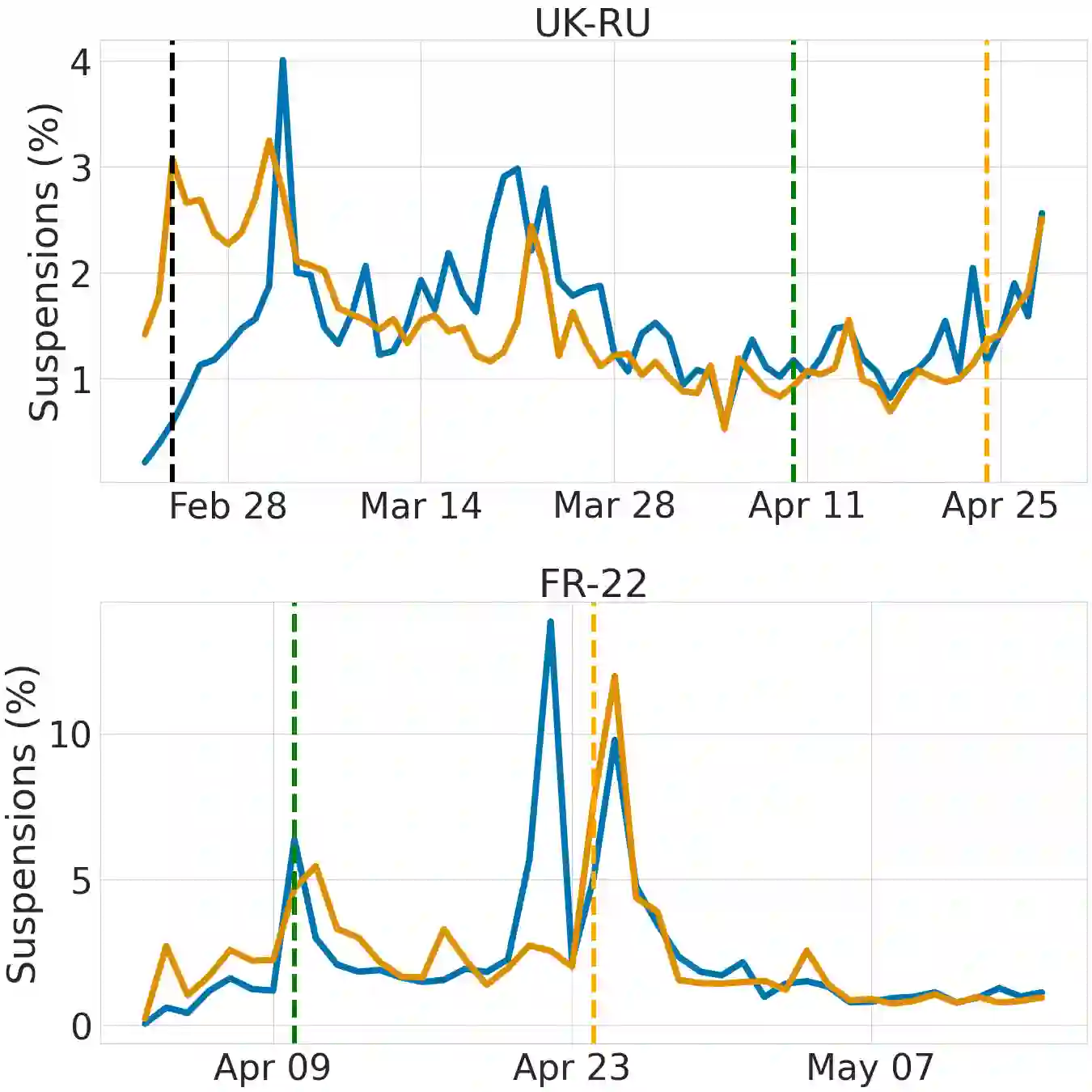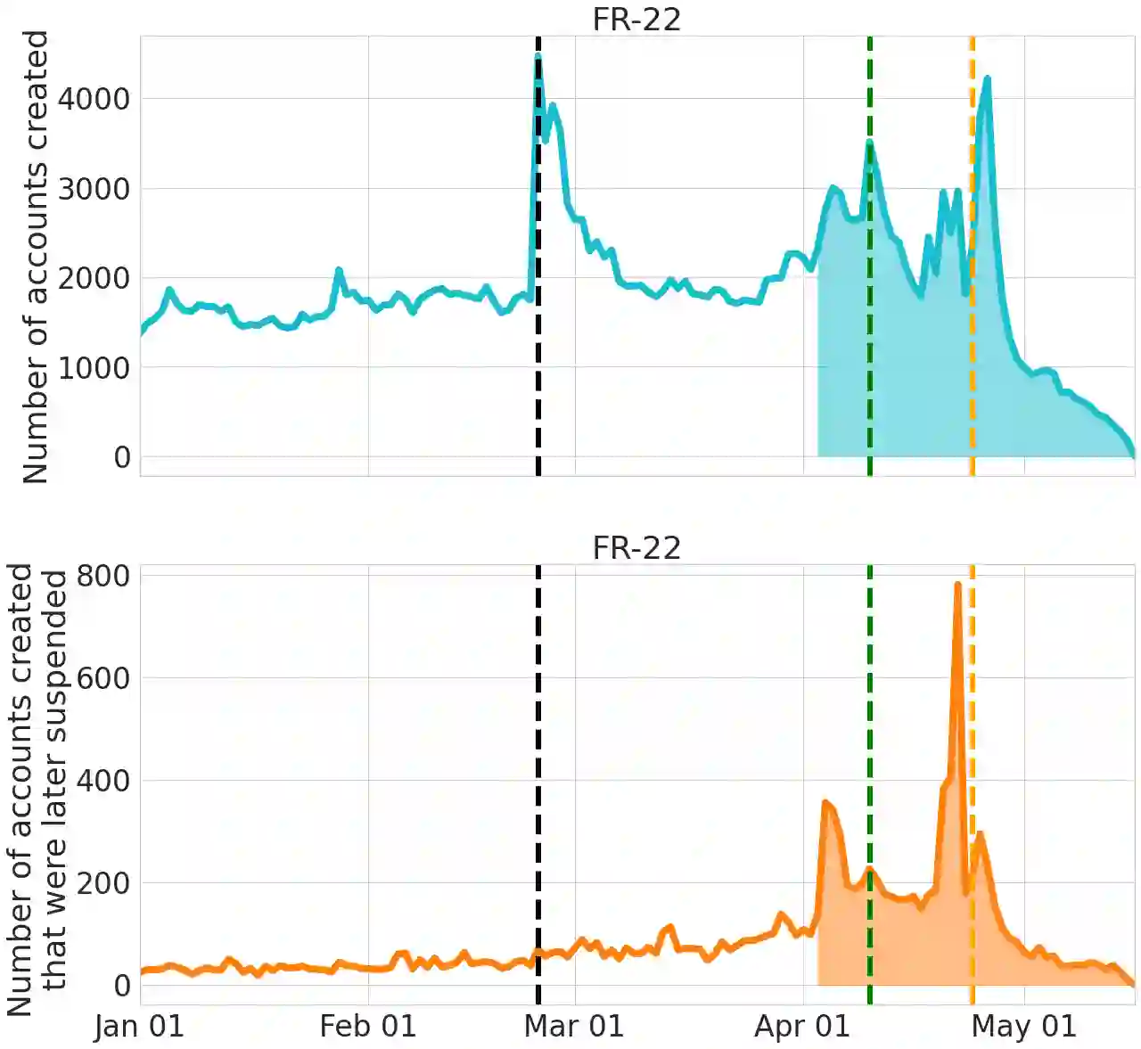 翻译:社会媒体温和政策往往成为公共辩论的中心,其实施和颁布有时被神秘的面纱所包围。 令人惊讶的是,由于平台透明度和数据访问有限,对温和动态的定性研究相对较少,特别是在有争议的事件和与之相关的平台活动方面。在这里,我们研究了两个全球政治事件:俄罗斯入侵乌克兰和2022年法国总统选举期间在Twitter上创建和暂停账户的动态:俄罗斯入侵乌克兰和法国总统大选。利用16M用户以多种语言分享的270M推特的大规模数据集,几个月来,我们发现了可疑账户创建和中止的高峰,我们描述的行为更经常导致账户暂停。我们显示了大量账户在创建后几天内被中止的情况。暂记账户往往与其他可疑账户相比,大多与合法用户互动,经常不必要和过度地使用答复和提及特征,并主要分享垃圾邮件和有害内容。 虽然我们只能猜测导致账户暂停的具体原因,但我们只能对重大事件期间的平台滥用和随后节制模式做出判断。