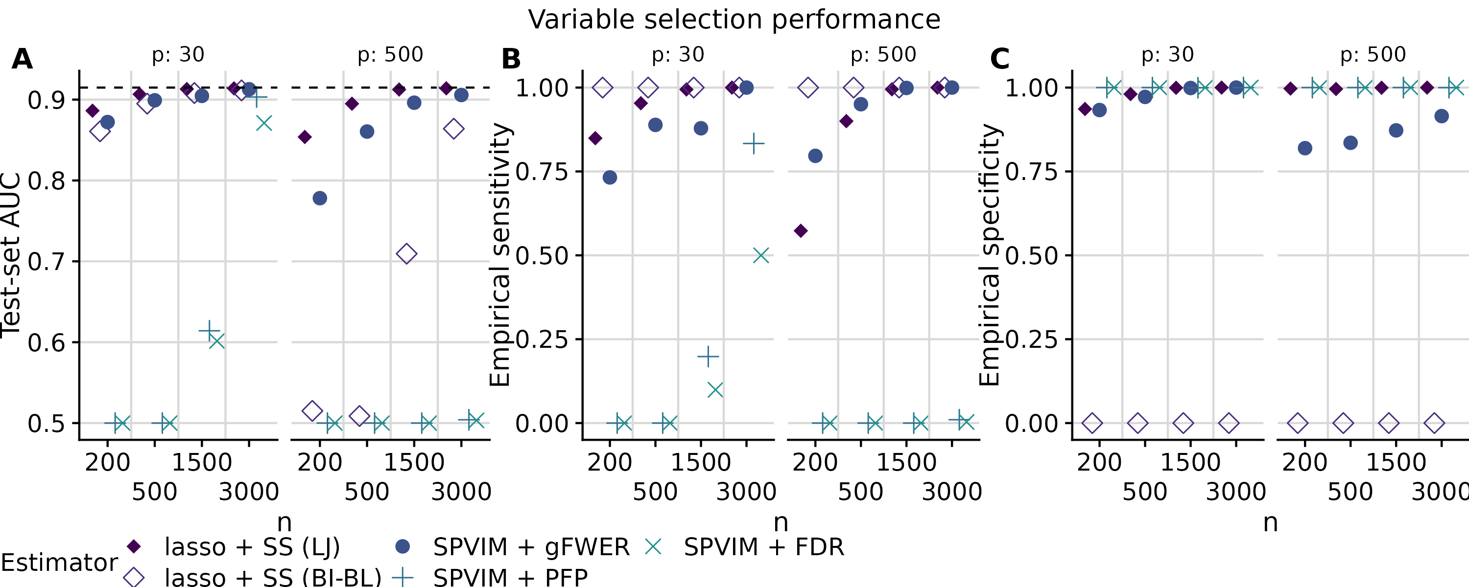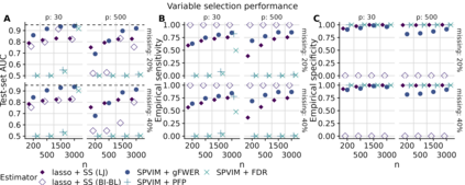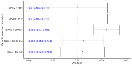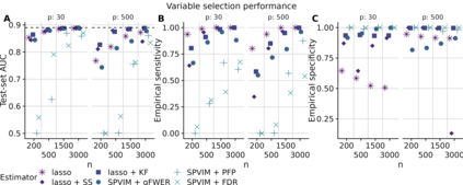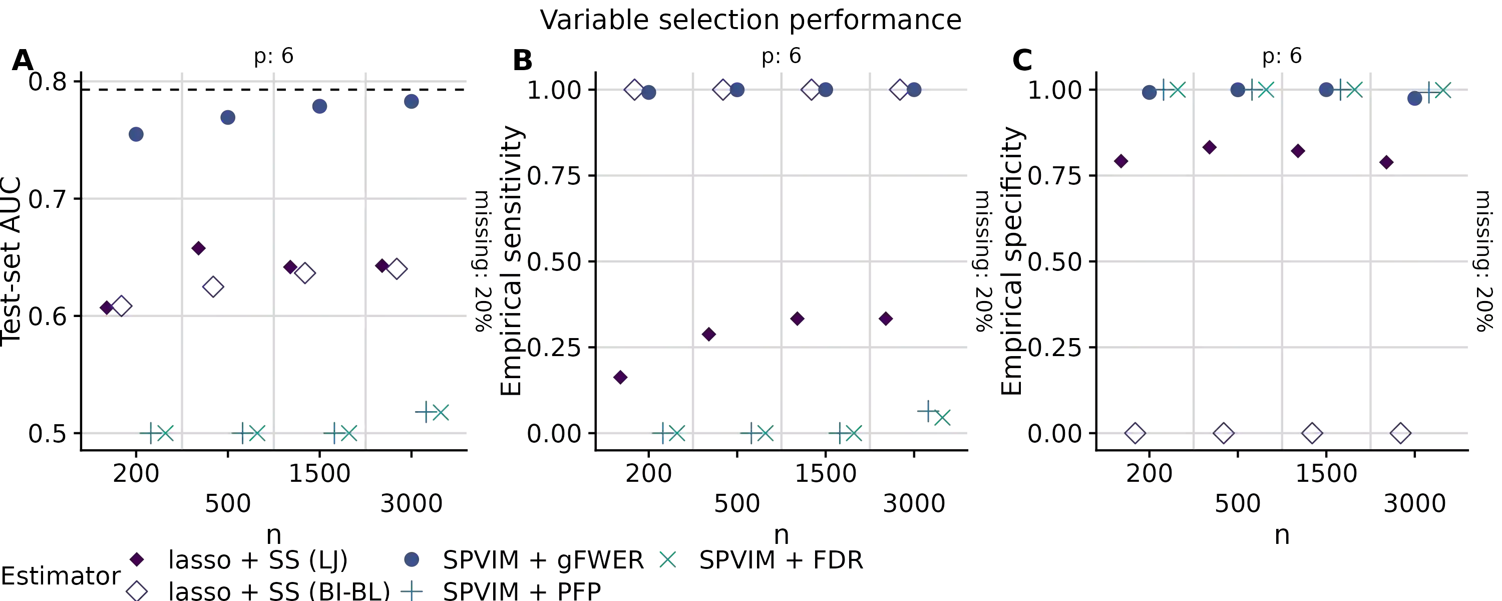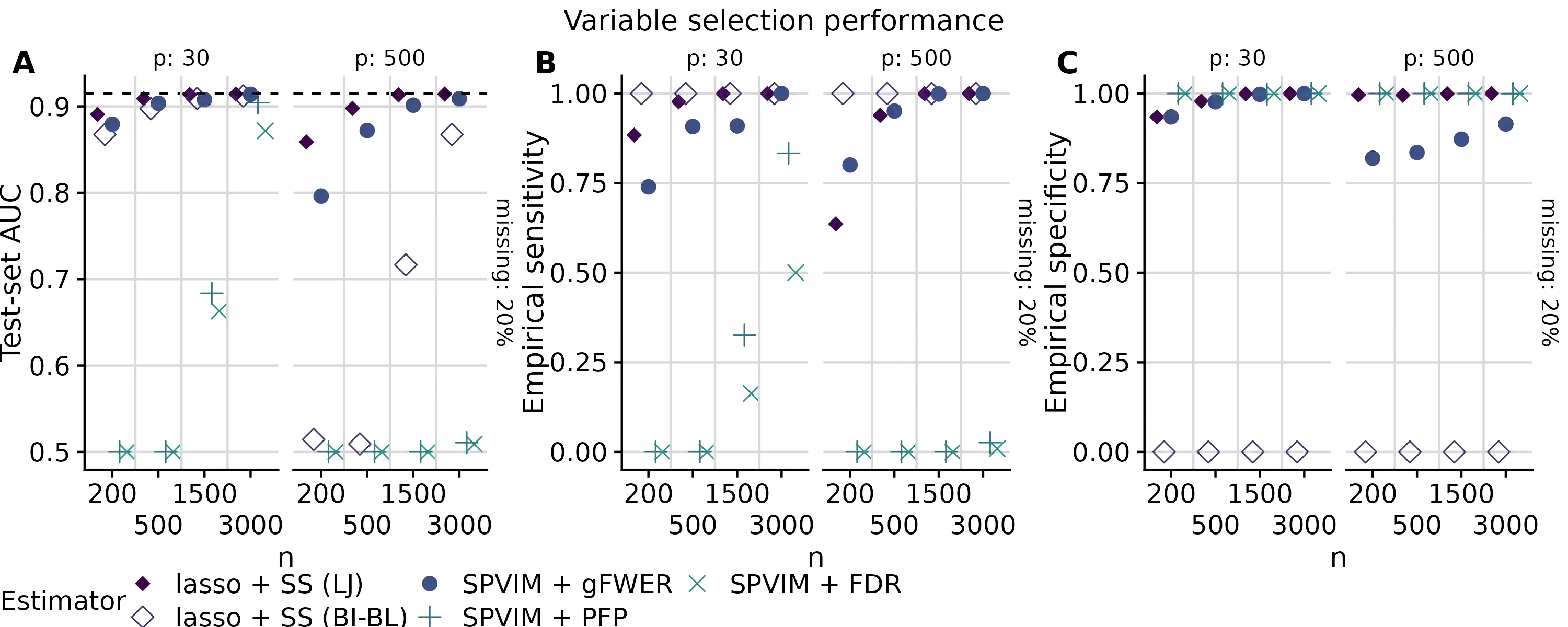 In many applications, it is of interest to identify a parsimonious set of features, or panel, from multiple candidates that achieves a desired level of performance in predicting a response. This task is often complicated in practice by missing data arising from the sampling design or other random mechanisms. Most recent work on variable selection in missing data contexts relies in some part on a finite-dimensional statistical model, e.g., a generalized or penalized linear model. In cases where this model is misspecified, the selected variables may not all be truly scientifically relevant and can result in panels with suboptimal classification performance. To address this limitation, we propose a nonparametric variable selection algorithm combined with multiple imputation to develop flexible panels in the presence of missing-at-random data. We outline strategies based on the proposed algorithm that achieve control of commonly used error rates. Through simulations, we show that our proposal has good operating characteristics and results in panels with higher classification and variable selection performance compared to several existing penalized regression approaches in cases where a generalized linear model is misspecified. Finally, we use the proposed method to develop biomarker panels for separating pancreatic cysts with differing malignancy potential in a setting where complicated missingness in the biomarkers arose due to limited specimen volumes.