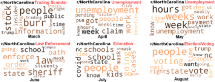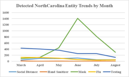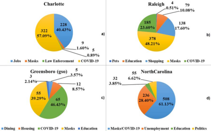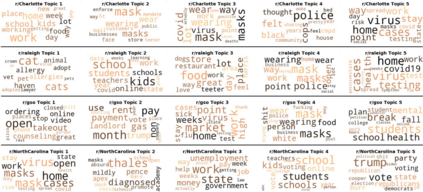 翻译:科罗纳病毒( COVID-19 ) 传染病改变了人们生活和行为的各个方面。 在现阶段,除了采取诸如戴面罩、观望距离和洗手等缓解战略之外,没有其他方法可以控制疾病自然蔓延。此外,在目前社会动荡时期,社交媒体在连接人们和提供表达情感的平台方面发挥着关键作用。在这项研究中,我们利用社交媒体来监视缓解和检测战略的采用,并捕捉有关该流行病的问题和关切。特别是,我们探讨了研究问题,“通过在Reddit 站上使用自然语言处理,在公众接受减缓战略和对COVID-19流行病的关切方面可以学到多少?”在从北卡罗来纳州四个最大的子编辑社区提取与COVID有关的职位六个月之后,我们进行了基于NLP的预处理来清理这些噪音数据。我们采用了一种习惯命名实体识别系统(NER) 和一种冷冻狄里特利特尔特( LDA) 分配(LDA) 模式,用于在再施用原体上进行主题建模。我们观察到的“mask” 最普遍的测量、最常用设备” 和“ 测试” 最常用的“ 最常用的“ 测试” 最常用” 和最常用的“ 和最常用的“ 测试”的“最常用设备” 和最常用的“最常用的“最常用” 测试” 测试” 主题” 。