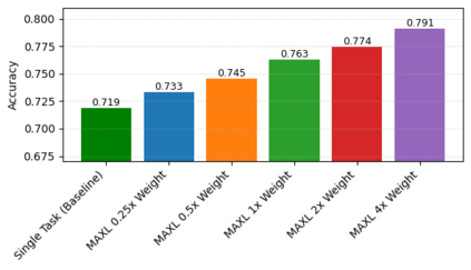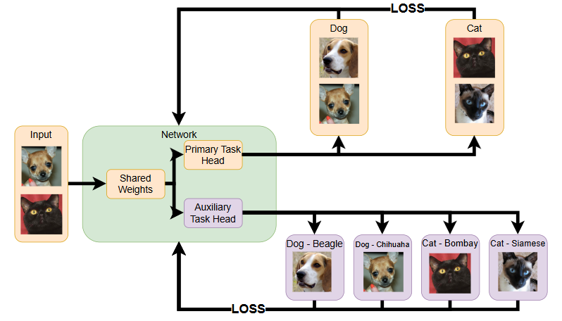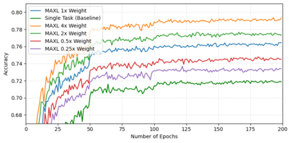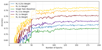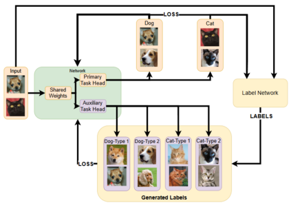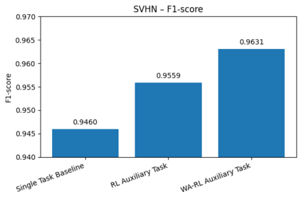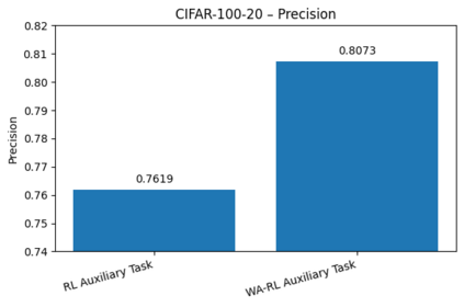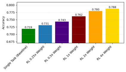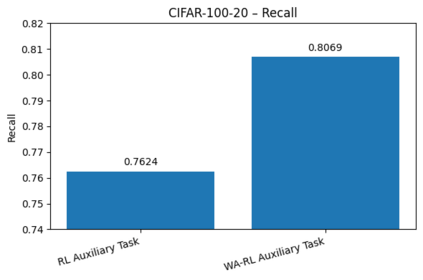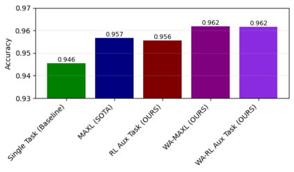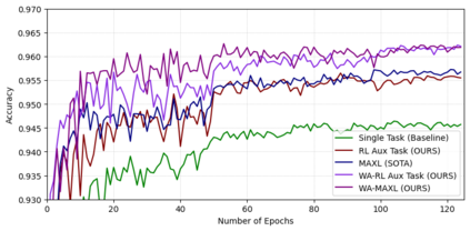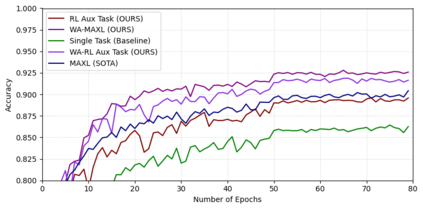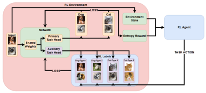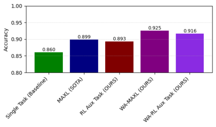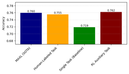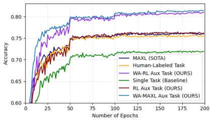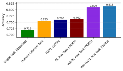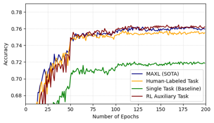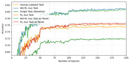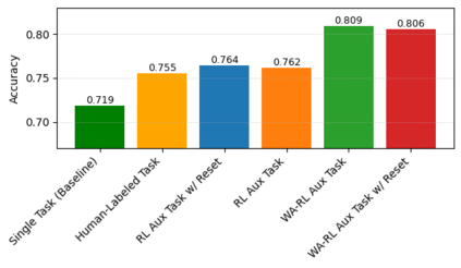 Auxiliary Learning (AL) is a form of multi-task learning in which a model trains on auxiliary tasks to boost performance on a primary objective. While AL has improved generalization across domains such as navigation, image classification, and NLP, it often depends on human-labeled auxiliary tasks that are costly to design and require domain expertise. Meta-learning approaches mitigate this by learning to generate auxiliary tasks, but typically rely on gradient based bi-level optimization, adding substantial computational and implementation overhead. We propose RL-AUX, a reinforcement-learning (RL) framework that dynamically creates auxiliary tasks by assigning auxiliary labels to each training example, rewarding the agent whenever its selections improve the performance on the primary task. We also explore learning per-example weights for the auxiliary loss. On CIFAR-100 grouped into 20 superclasses, our RL method outperforms human-labeled auxiliary tasks and matches the performance of a prominent bi-level optimization baseline. We present similarly strong results on other classification datasets. These results suggest RL is a viable path to generating effective auxiliary tasks.