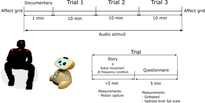 翻译:在未来十年里,社会机器人将在许多公共空间实施,为人类提供服务。我们质疑这些社会机器人的特性,以获得接受和自发的情感互动。更具体地说,在本研究中,我们报告机器人在面对面的互动任务中,在与一名人类参与者面对面的互动任务中,无意识运动频率对情感传染的影响。机器人系统Buddy编程采取悲伤的姿态和面部表情,同时讲述三个悲哀故事,在低、中、高频率上下移动。每个参与者(总共N=15)都应邀坐在Buddy面前,倾听故事。在3D运动捕捉系统中记录了人类参与者态势的不觉变化(Quasulization)。结果显示,在低频率试验和高频率试验中,肩/肩/肩对地面的倾向更加强烈。当Buddy移动速度缓慢时,自发运动的数量也会增加。当两个个人参与社会互动时,这些结果会在实验心理学中回响。在上帝速度问卷中获得的分数进一步表明,当朋友运动动作动作缓慢时,可能会发生情感传染,因为机器人运动的频率系统具有更连续的频率和机变速度。