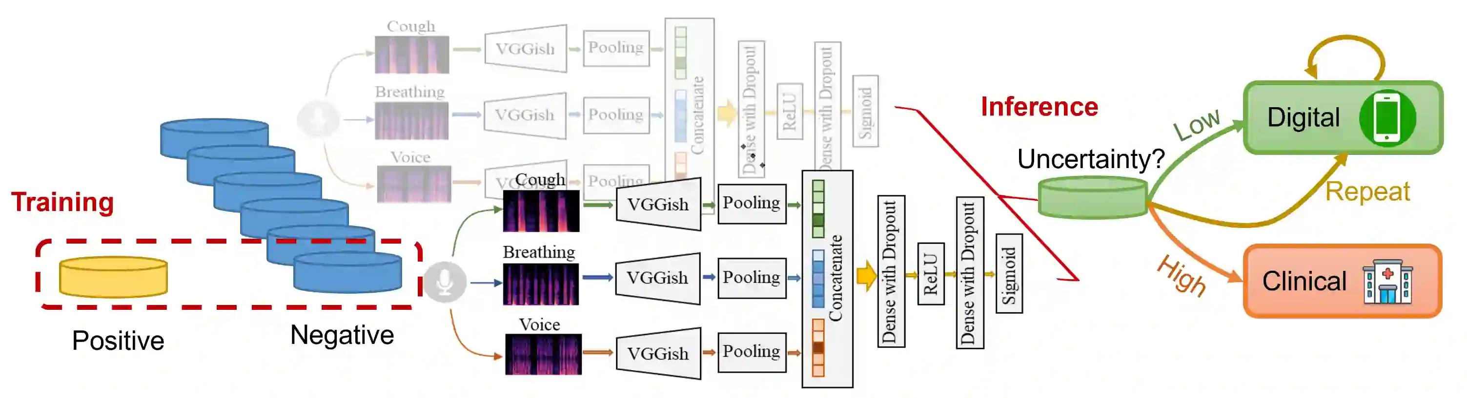 翻译:最近,基于声音的COVID-19检测研究显示,实现可扩展和迅速数字预检的极佳前景大有希望,然而,仍然存在两个阻碍这一做法的未解决的问题。首先,为模型培训收集的数据集往往不平衡,而为模型培训收集的数据集往往有相当小一部分的用户测试呈阳性,因此难以学习具有代表性和强健的特征。第二,深层次的学习模型在预测中通常过于自信。临床上,假预测会加剧保健费用。估计筛查的不确定性将有助于这一点。为了处理这些问题,我们提出了一个共同框架,在这个框架中,从原始数据的不同但平衡的子组中开发了多种基于声音的COVI-19检测的深层学习模型。由于这个框架,数据得到更有效的利用,与传统的上层和下层抽样方法相比:一个0.74的ACUC,其敏感性为0.68,其特性为0.69。同时,我们估计从多个模型之间的分歧中产生的不确定性会有所帮助。我们发现,假预测往往产生更高的不确定性,使我们能够建议用户在比门槛更高的程度上重复对手机进行稳健的自动测试,或者进行临床测试。