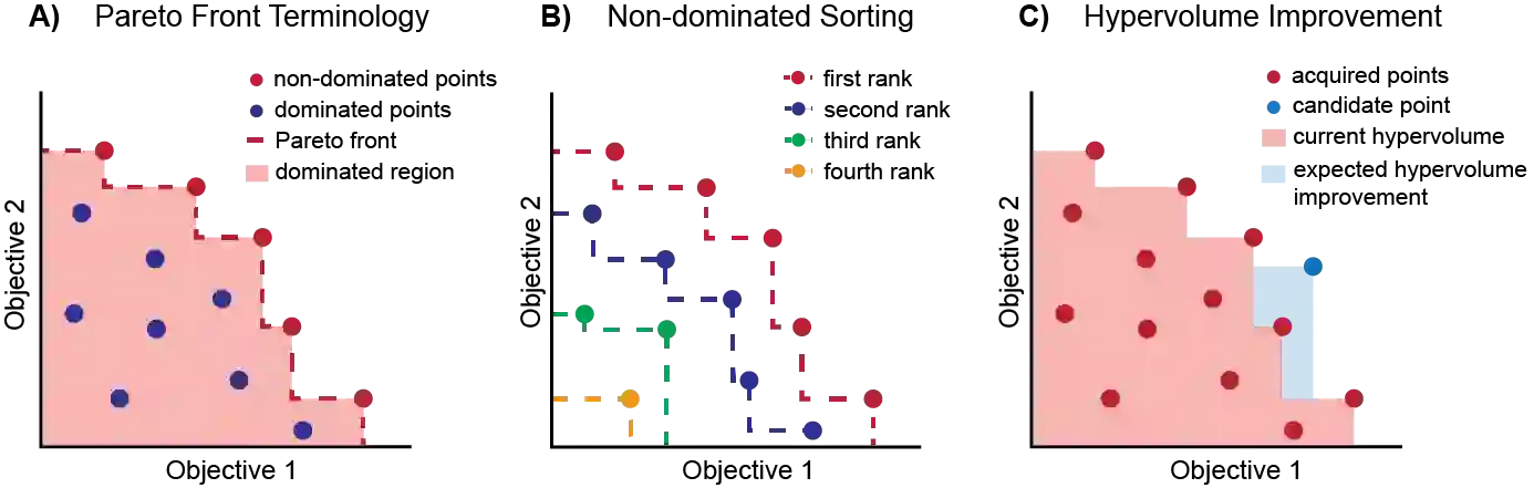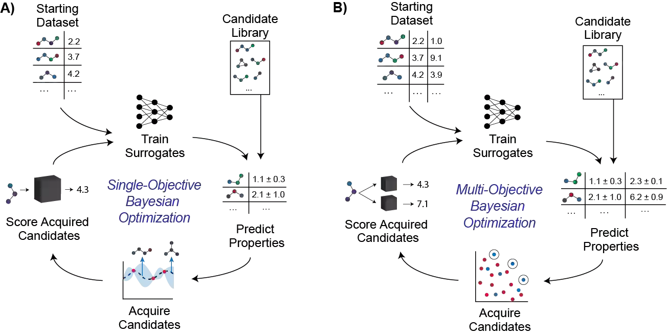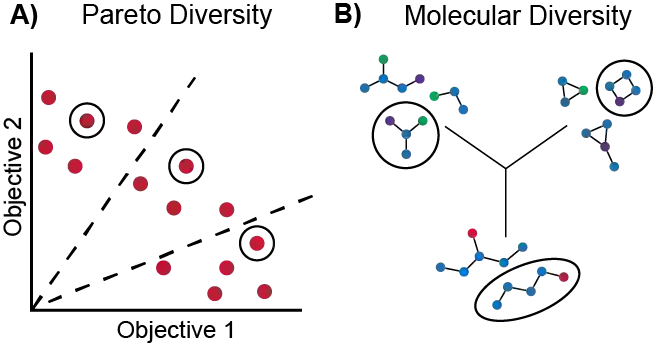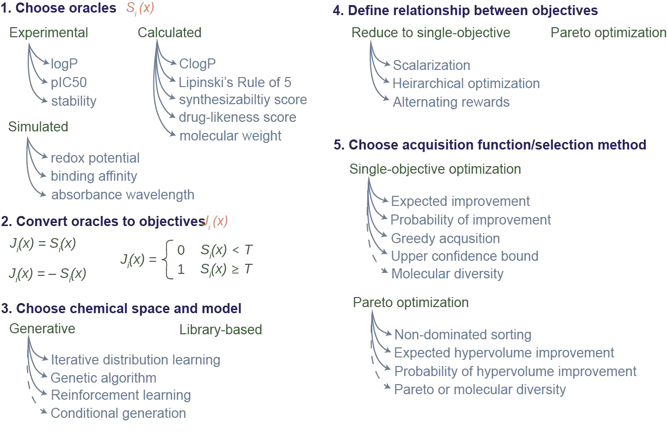 翻译:分子发现是一个多客观的优化问题,它要求确定一个分子或一组分子,平衡多种、往往是相互竞争的特性。多客观的分子设计通常通过使用缩放法将感兴趣的特性结合成单一的客观功能来解决,这种剖析法对相对重要性的假设没有多少发现,对目标之间的取舍也很少发现。与缩放法相比,Pareto优化并不要求了解相对重要性,而是揭示了目标之间的取舍。然而,它提出了算法设计中的额外考虑。在本次审查中,我们描述了以Pareto优化算法为焦点的多目标分子发现以集合为基础和无异基因化方法进行。我们展示了基于集合分子的发现是如何将多目标巴耶斯优化法相对直接延伸的,以及不同基因化模型从单一目标到多目标优化的方式如何以类似的方式扩展,使用非主排序功能(强制学习)或选择分子用于再培训(分配学习)或传播(遗传算法)的。最后,我们讨论了该领域中仍然存在的一些挑战和机遇,强调采用巴伊斯最佳设计技术的机会。