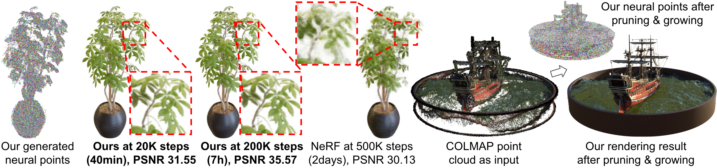 Volumetric neural rendering methods like NeRF generate high-quality view synthesis results but are optimized per-scene leading to prohibitive reconstruction time. On the other hand, deep multi-view stereo methods can quickly reconstruct scene geometry via direct network inference. Point-NeRF combines the advantages of these two approaches by using neural 3D point clouds, with associated neural features, to model a radiance field. Point-NeRF can be rendered efficiently by aggregating neural point features near scene surfaces, in a ray marching-based rendering pipeline. Moreover, Point-NeRF can be initialized via direct inference of a pre-trained deep network to produce a neural point cloud; this point cloud can be finetuned to surpass the visual quality of NeRF with 30X faster training time. Point-NeRF can be combined with other 3D reconstruction methods and handles the errors and outliers in such methods via a novel pruning and growing mechanism.