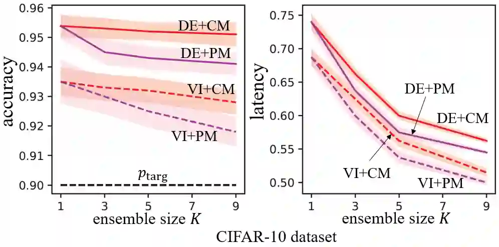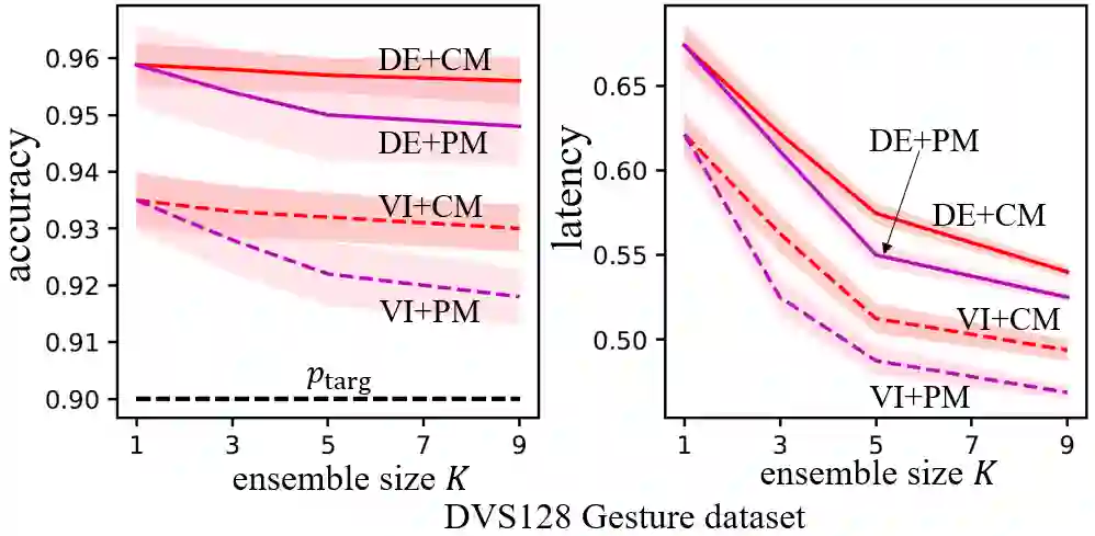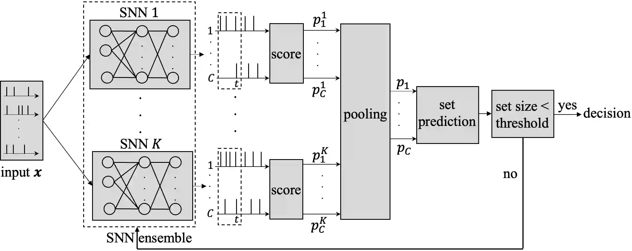 Spiking neural networks (SNNs) are recurrent models that can leverage sparsity in input time series to efficiently carry out tasks such as classification. Additional efficiency gains can be obtained if decisions are taken as early as possible as a function of the complexity of the input time series. The decision on when to stop inference and produce a decision must rely on an estimate of the current accuracy of the decision. Prior work demonstrated the use of conformal prediction (CP) as a principled way to quantify uncertainty and support adaptive-latency decisions in SNNs. In this paper, we propose to enhance the uncertainty quantification capabilities of SNNs by implementing ensemble models for the purpose of improving the reliability of stopping decisions. Intuitively, an ensemble of multiple models can decide when to stop more reliably by selecting times at which most models agree that the current accuracy level is sufficient. The proposed method relies on different forms of information pooling from ensemble models, and offers theoretical reliability guarantees. We specifically show that variational inference-based ensembles with p-variable pooling significantly reduce the average latency of state-of-the-art methods, while maintaining reliability guarantees.